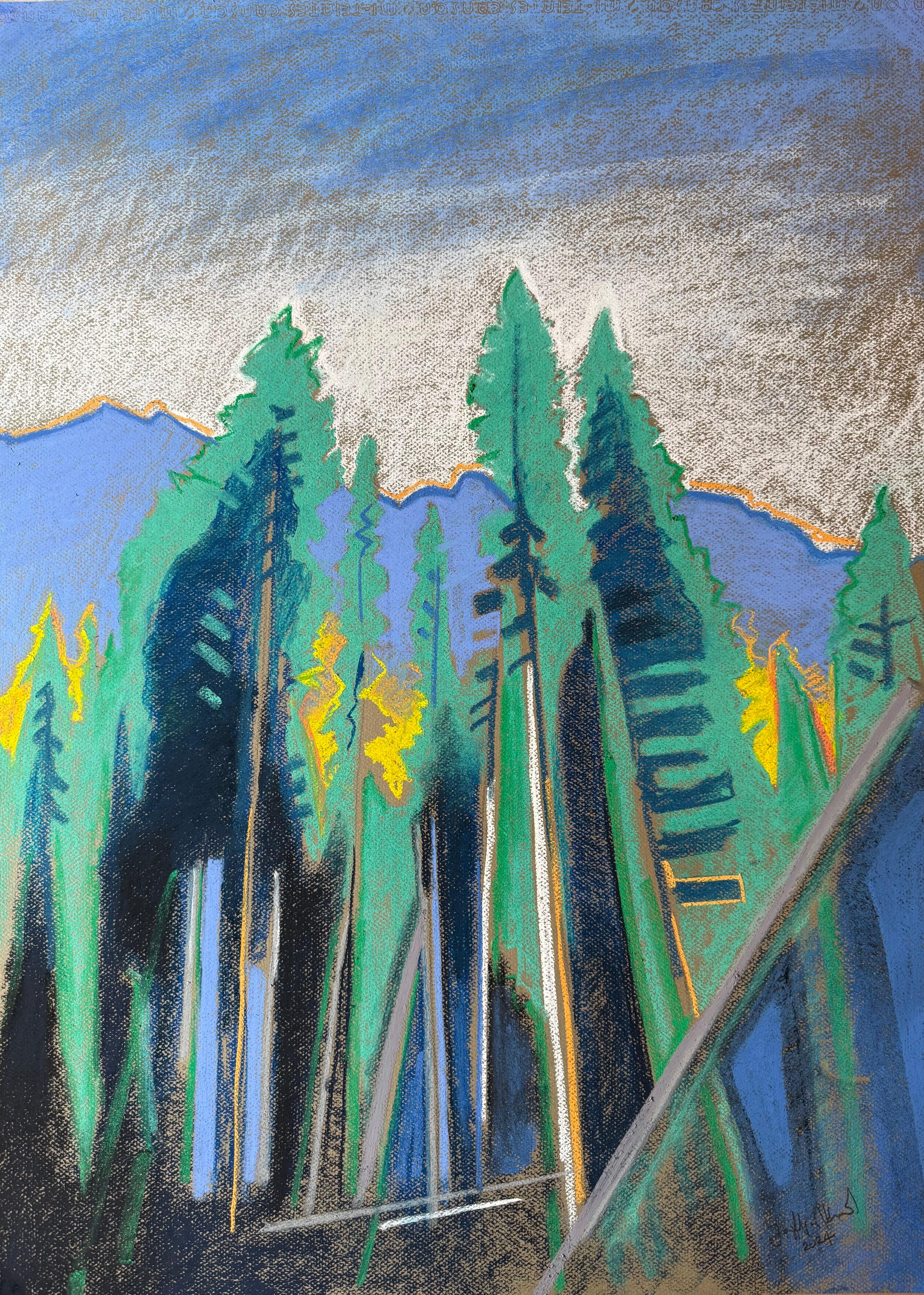Pastell-Landschaft von Irina Hale (Britin 1932-2022) Pastellskizze auf braunem Künstlerpauspapier, ungerahmt Gemälde: 4,5 x 3,75 Zoll Provenienz: Privatsammlung, Cotswolds Zustand: s...