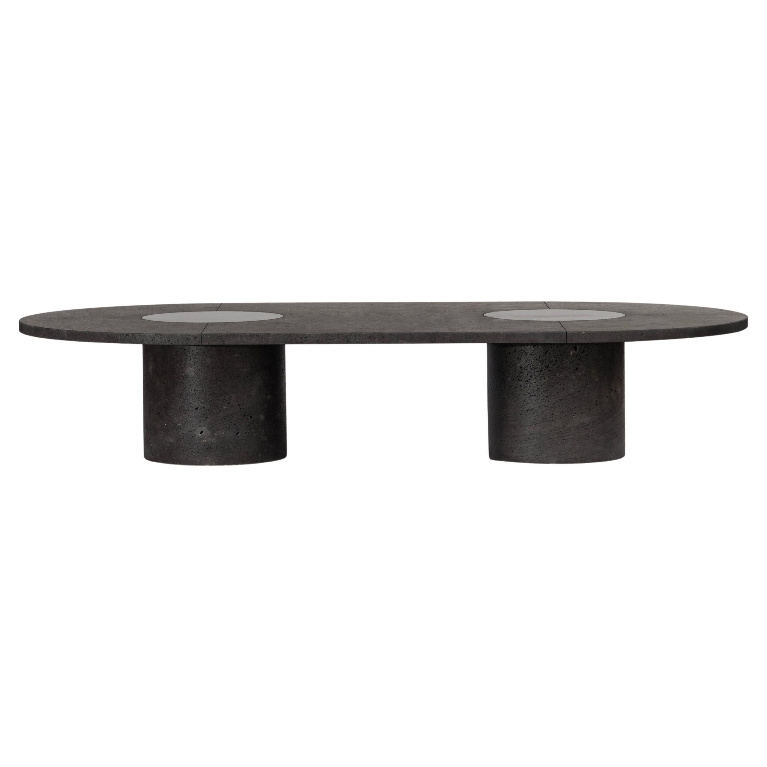 Unsere Ehrfurcht vor der Pracht des Vulkangesteins hat uns dazu gebracht, dieses edle Material mit einem Tisch/Skulptur zu ehren, dessen reichhaltige, poröse Platte auf drei zylindri...