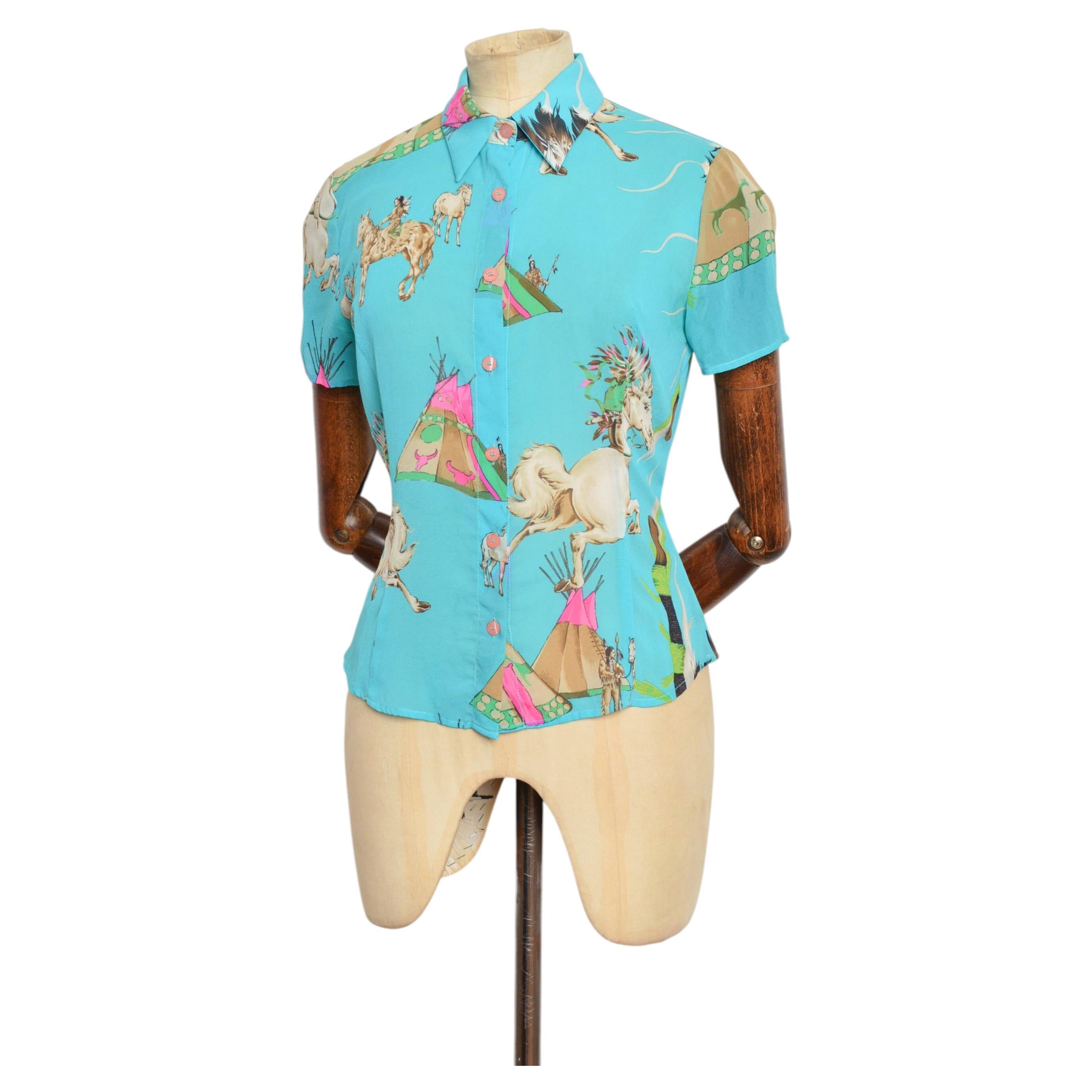 Donatella Versace Laufsteg-Top für Frühjahr/Sommer 2004, gefertigt in einem farbenfrohen Pop-Art-Druck, mit Rundhalsausschnitt, pinkfarbenen Paspelkanten und dem kultigen Versace-Log...