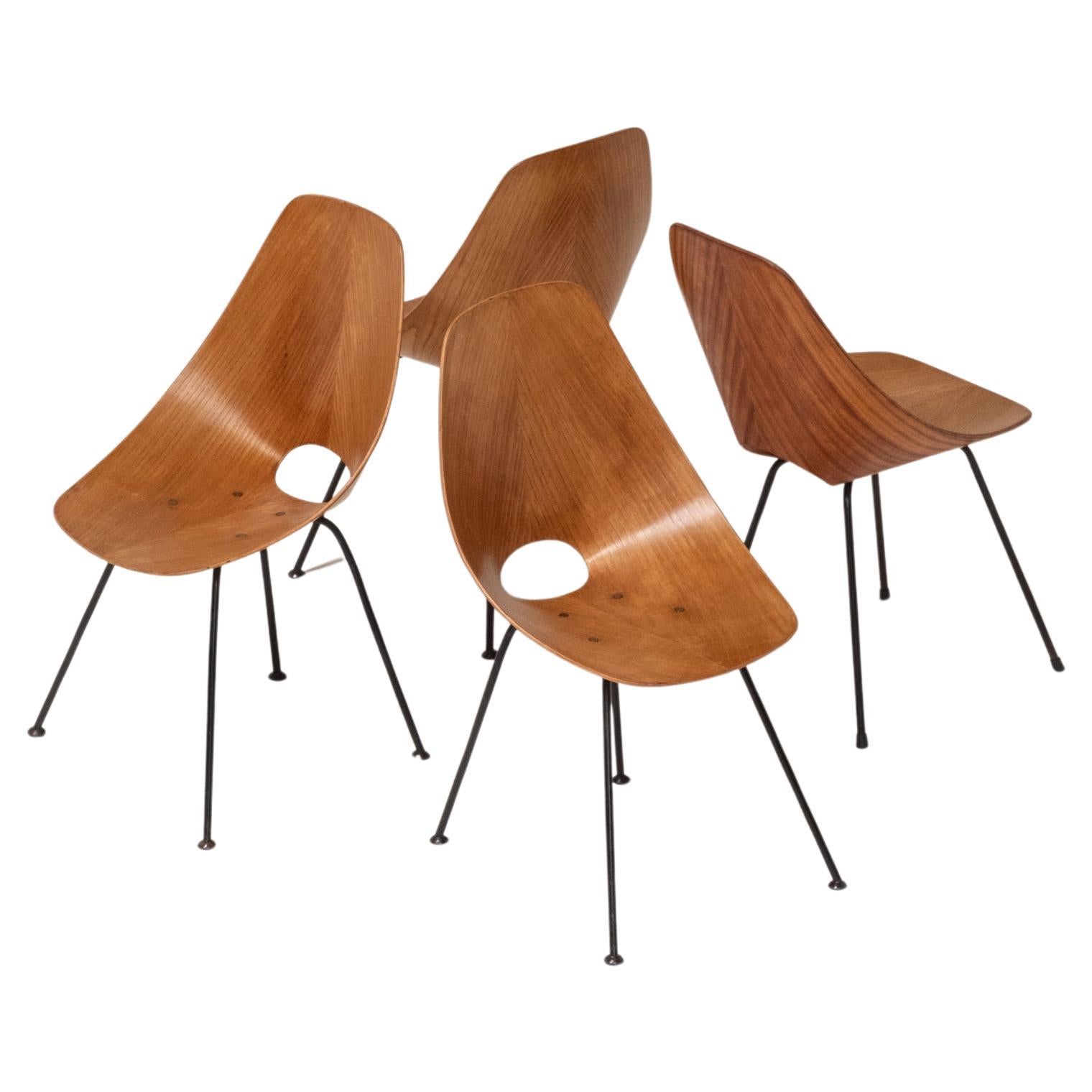 Italienisch Mitte des Jahrhunderts Satz von vier Stühlen Modell Medea von Vittorio Nobili entworfen und von Fratelli Tagliabue produziert, Dieser Stuhl aus furniertem Sperrholz und l...