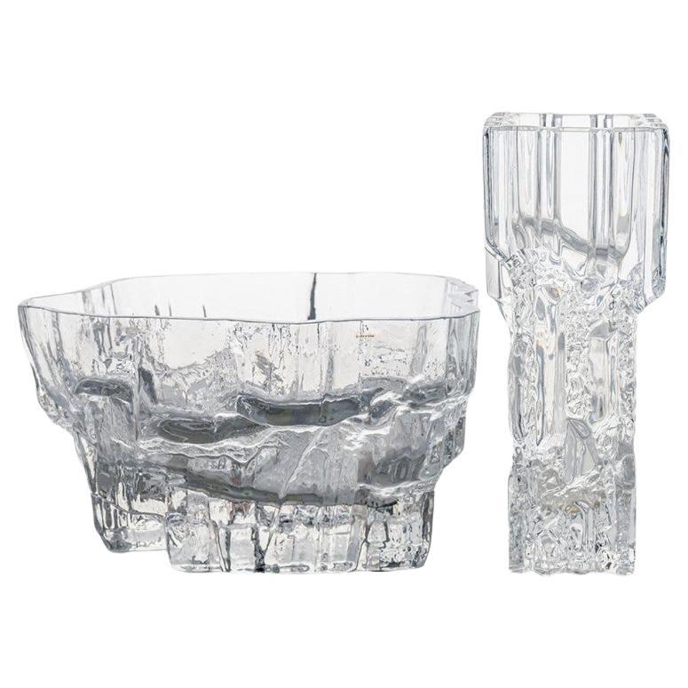 Das Set besteht aus einer großen Schale aus Kunstglas mit Fuß namens "Inari" und einer Glasvase namens "Kantarelli", die der renommierte finnische Künstler und Designer Tapio Wirk...