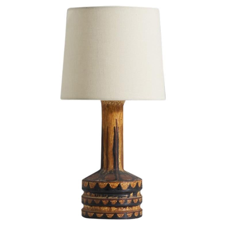 Wunderschöne Keramik-Tischlampe der bekannten dänischen Keramikerin Jette Hellerøe, die in den 1970er Jahren in ihrer eigenen Werkstatt hergestellt wurde. Die Lampe hat eine satte dunkelbraune und hellbraune glasierte Oberfläche, die mit dekorativen Herz- und organischen Motiven in einem strukturierten Muster verziert ist. Auf dem Sockel ist Hellerøes Unterschrift eingraviert und der Originalaufkleber mit der Aufschrift "Jette Hellerøe Keramik Lønstrup" ist noch vorhanden.