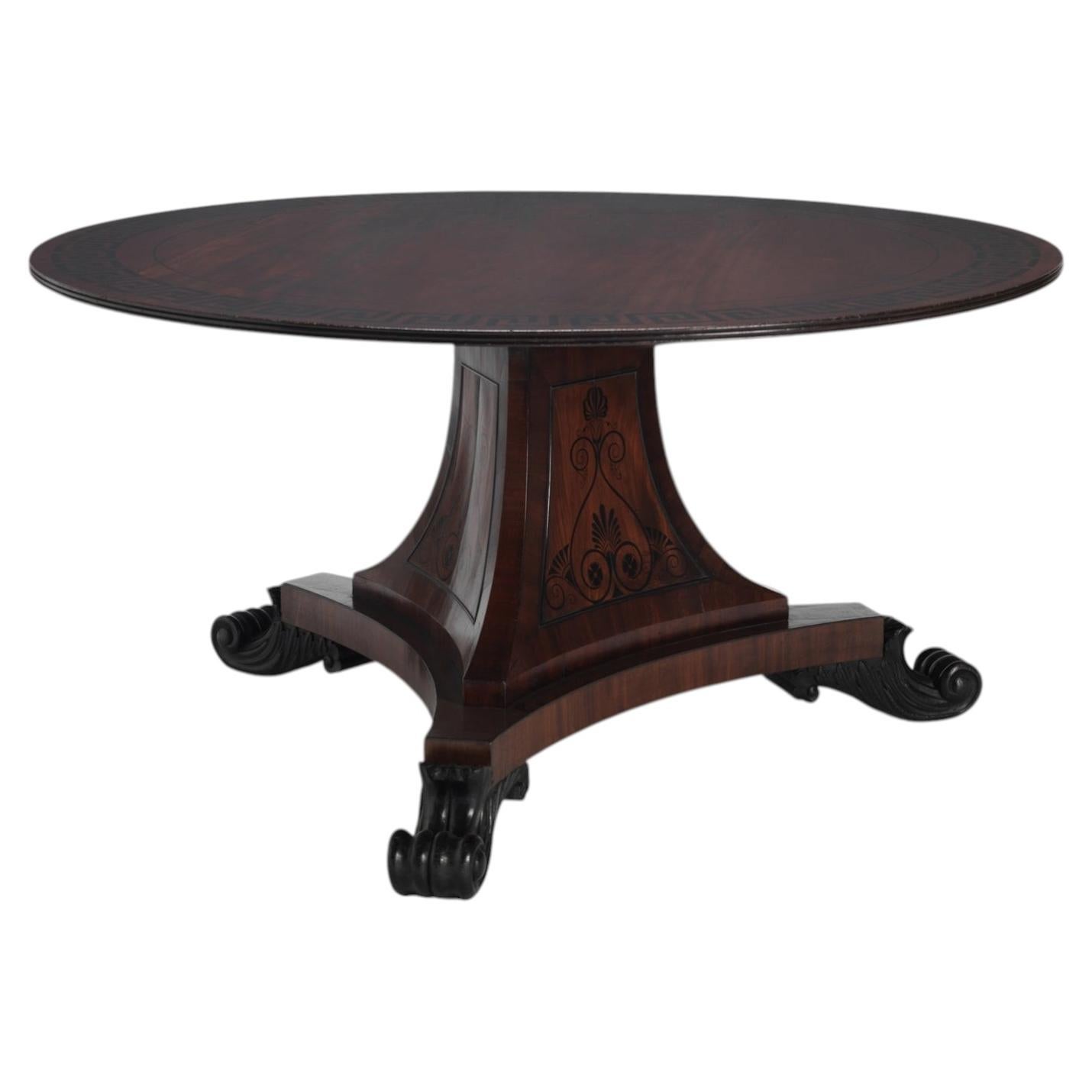 Ein feiner kreisförmiger Thomas Hope Design verschlungene Schlange Mitteltisch. Die Marmorplatte ruht auf einem profilierten Fries, der von außergewöhnlichen, ineinander verschlungen...