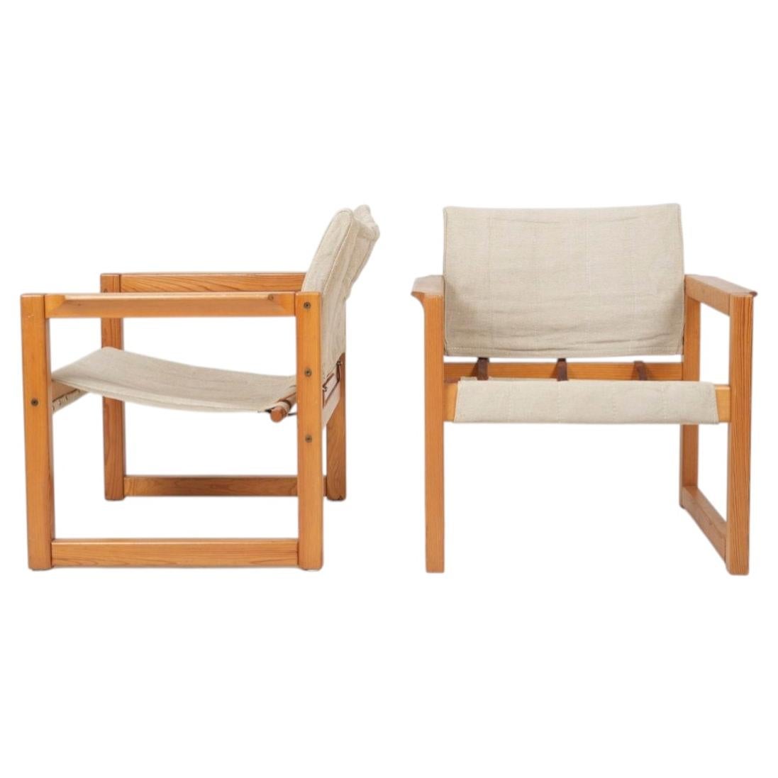 Das Modell "Diana" im Safaristil wurde von Karin Mobring entworfen und 1972 für IKEA, Schweden, hergestellt. Gestelle aus massivem Kiefernholz mit genähten Sattelleder-Sitzflächen un...