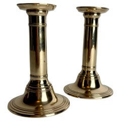 Paar Kerzenständer aus Messingguss, gedrechselt, aus der Zeit des französischen Empire. Die birnenförmigen Kerzenschäfte werden von wulstigen Spulen und einem gedrechselten Knauf übe...