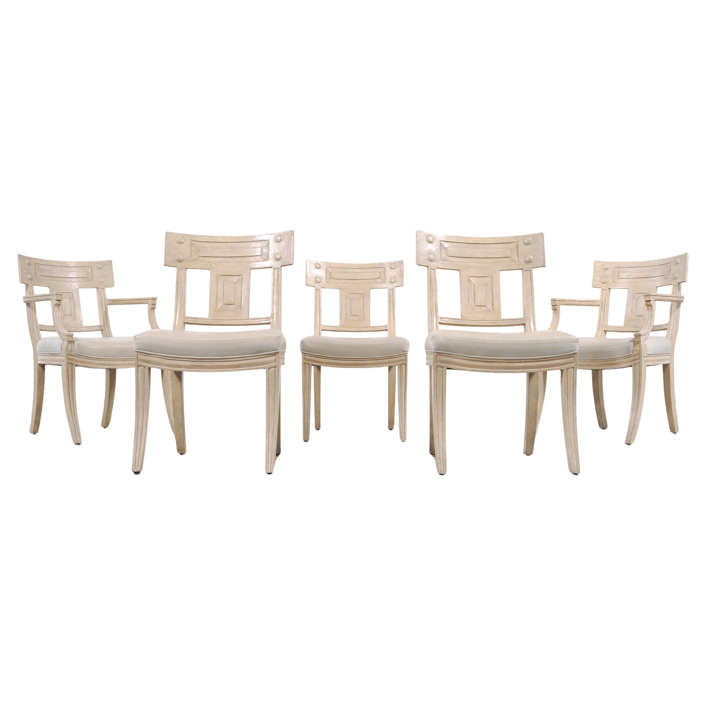 Ein ikonisches und raffiniertes Set von fünf Stühlen mit dem Label "White Klismos" von Michael Taylor Designs, bestehend aus zwei Sesseln und drei Beistellstühlen. Die Stühle sind im...