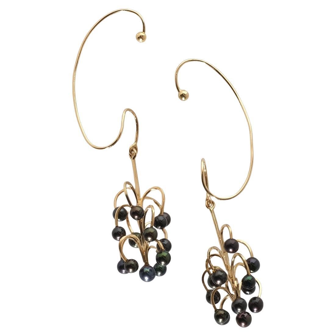 Diese skulpturalen Ohrringe, die 1965 von Sigurd Persson entworfen wurden, sind aus 18 Karat Gold gefertigt und mit Zuchtperlen besetzt. Der Anhänger bildet eine dichte und doch luft...