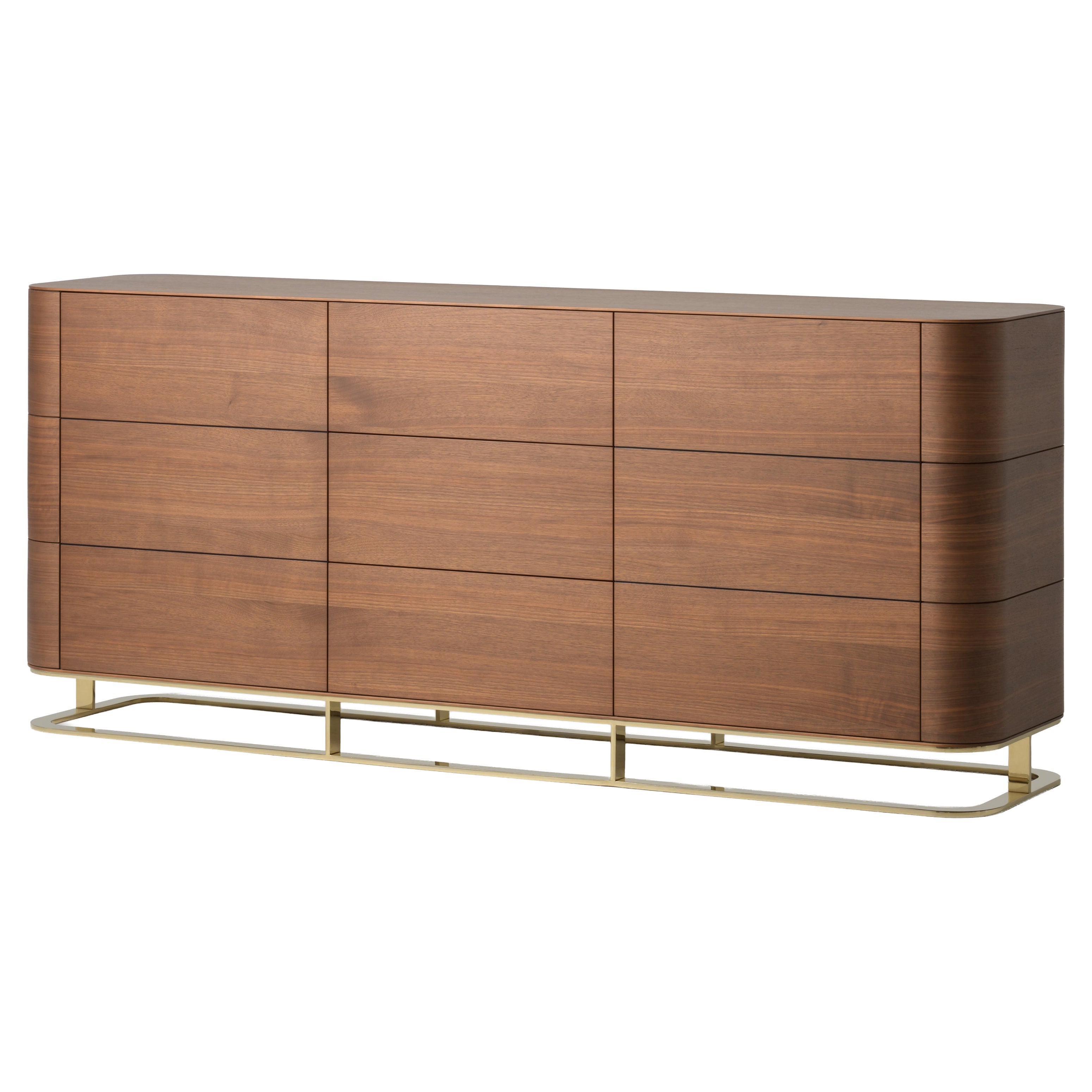 Eine minimalistische und elegante Kommode aus mokkafarbenem Eichenfurnier mit einer sanft geschwungenen, ovalen Silhouette. Die nahtlosen Schubladenfronten haben klare Linien mit sub...