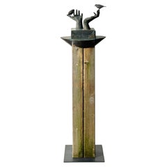 Totemic Figurative Skulptur, patinierte Bronze Hände & Vögel auf Holzsäule Basis