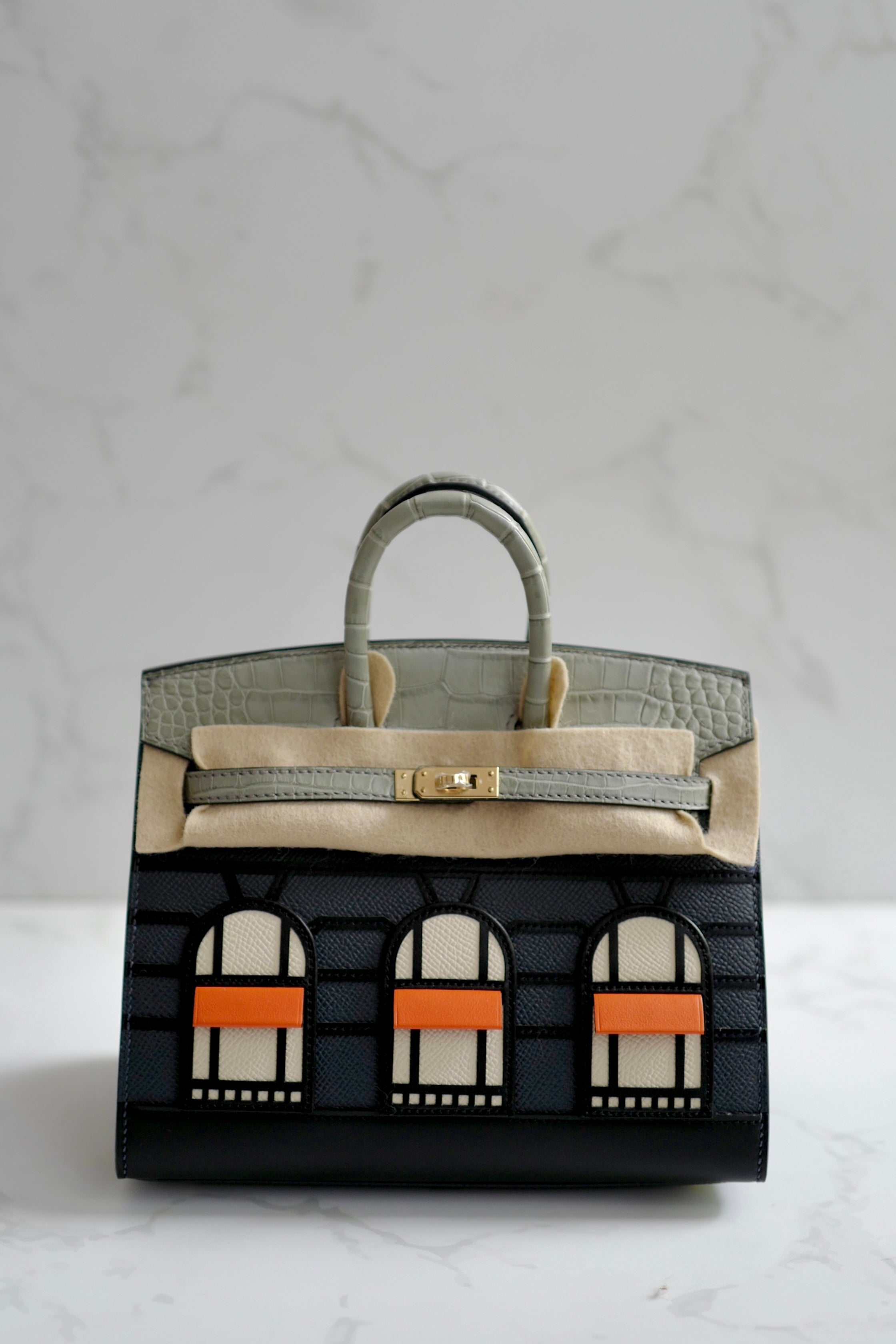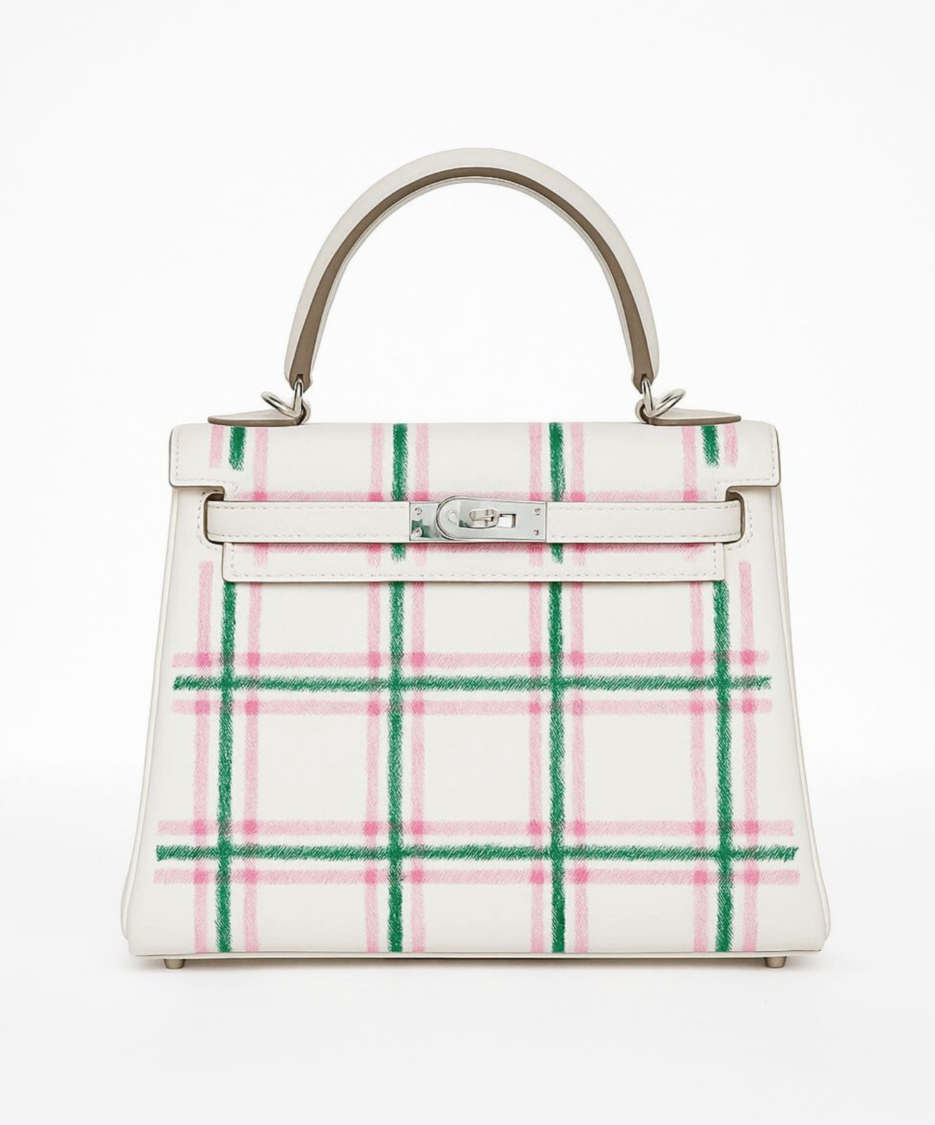 Bei der Hermès Kelly 25 Sellier in Tartan Check trifft Pariser Eleganz auf verspielte Kunstfertigkeit. Die Oberfläche aus strahlend weißem Leder ist mit handgemalten rosa und grünen ...