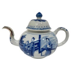 Eine blau-weiße Porzellan-Teekanne mit silbermontiertem Ausguss. Auf der Vorder- und Rückseite ...