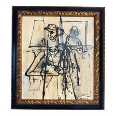 Abstraktes figuratives antikes Ölgemälde aus der Mitte des Jahrhunderts