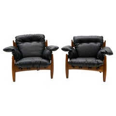 Zwei Sergio Rodrigues / Rodriquez Sheriff Stühle. Fachmännisch restauriert und aufgearbeitet. Neue schwarze Lederpolsterung nach dem Muster der Originalpolsterung. Optisch erhaben...