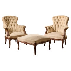 Paar Sessel mit gepolsterter Rückenlehne aus dem 19. Jahrhundert und passender Hocker