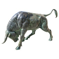 Eine imposante Stierskulptur aus Bronze, die sich durch ihre kraftvolle Präsenz und ihre detaillierte anatomische Modellierung auszeichnet. Die Figur in dynamischer Pose mit gesenkte...