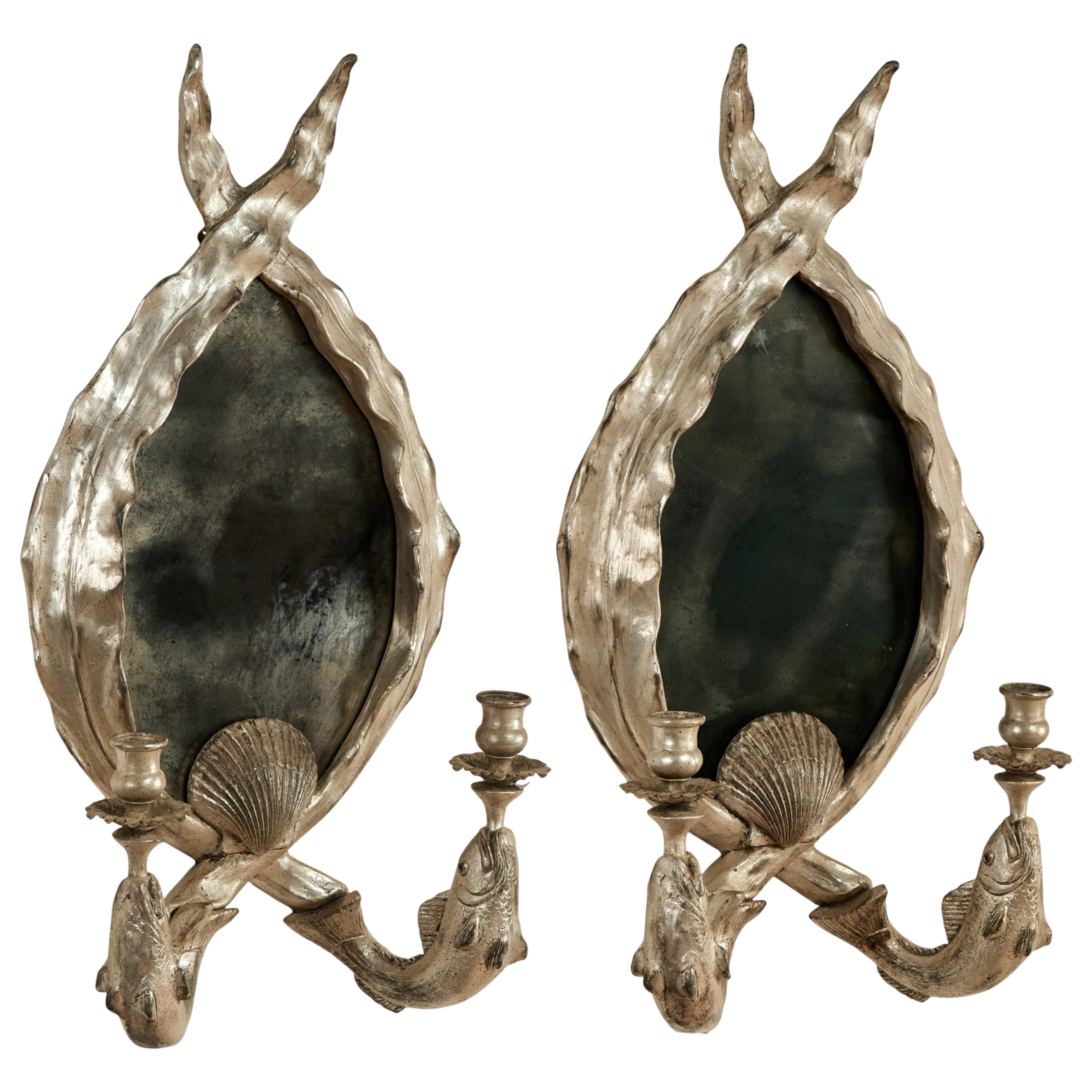 Hochgewachsenes Paar Wandleuchter in Komposition in einer ungewöhnlichen neoklassizistischen Grottenform mit Bändern, Fischen und Muscheln in versilberter Ausführung um notleidende S...