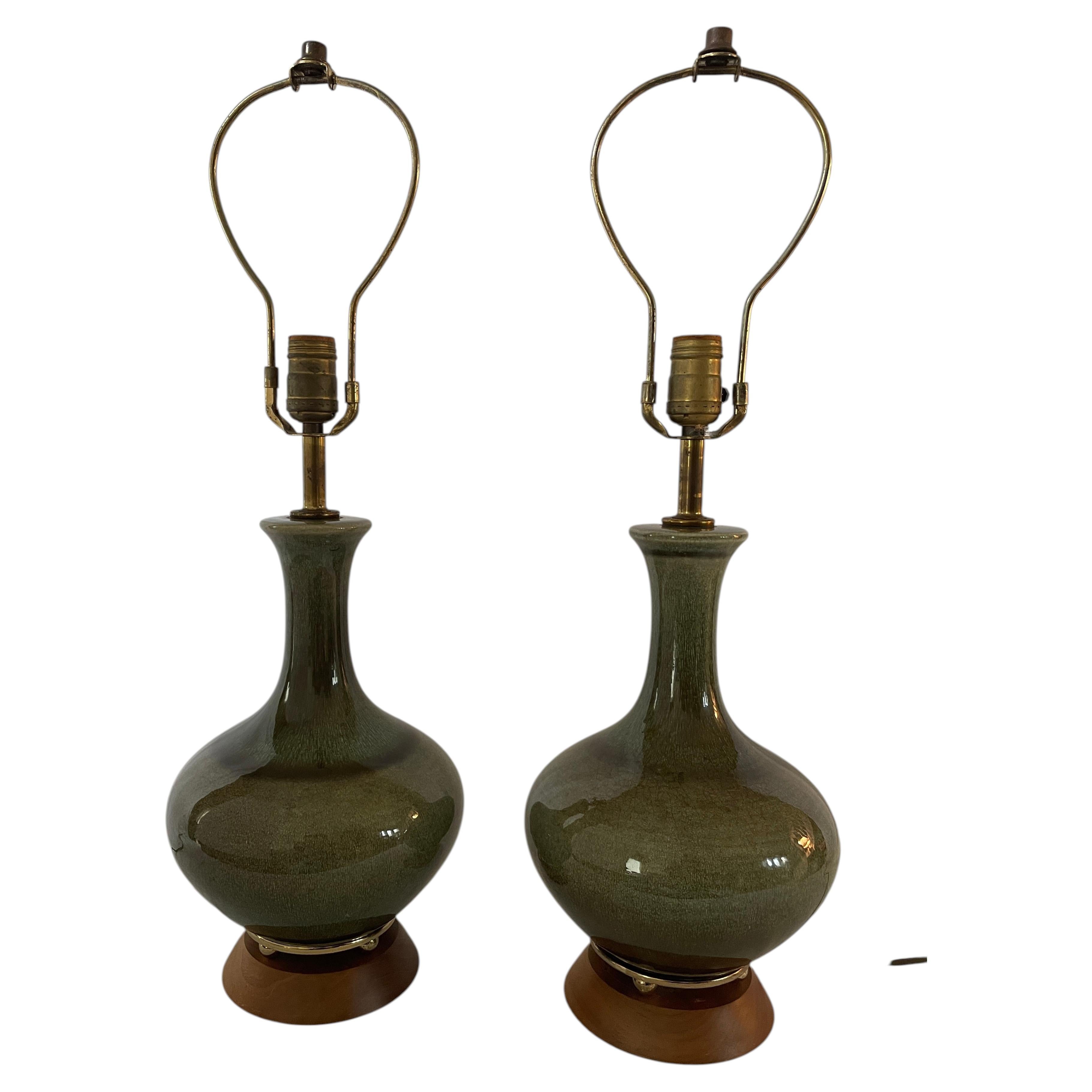 Zwei Tischlampen aus der spanischen Renaissance, hergestellt aus alten Fajalauza-Keramikamphoren, Granada. Handbemaltes grünes Kupfer und cremefarbene Glasur mit maßgeschneiderten na...