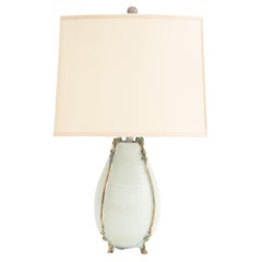 A Steingutkörper in Balusterform mit hoher, bauchiger Schulter, vier kleinen Riemenhenkeln an der Schulter, kurzem Hals und ausgestelltem Fuß mit unglasiertem Fußrand. Die Dekoration besteht aus vier eingeschnittenen Pfingstrosen auf dem mittleren Teil des Körpers, der zwischen den Griffen liegt. Die Seladonglasur bedeckt insgesamt mit Farbvariationen, einschließlich eines dunkleren Blitzes diagonal über den Körper, ungleichmäßige Glasur Craquelé und krakeliert in Bereichen. Ausgezeichneter Zustand. 12-1/2 Zoll hoch x 8 Zoll im Durchmesser. (32 x 20,3 cm).