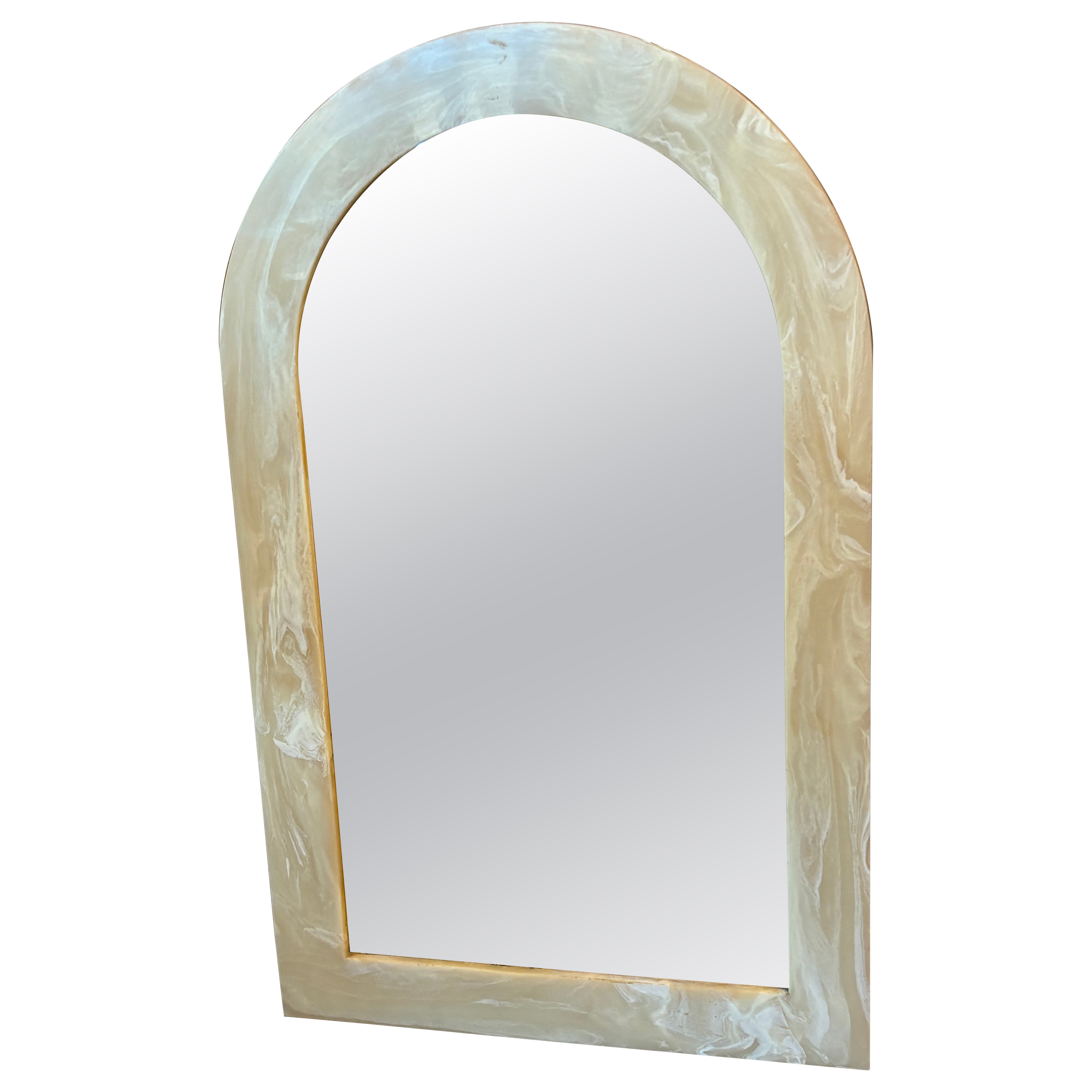 Vintage 1970s Onyx Marmor Stein gewölbt Bogen Wandspiegel. Wird aufhängefertig geliefert. Neuer Spiegeleinsatz. Zum Zeitpunkt der Auflistung ist der passende Onyx-Konsolentisch separ...