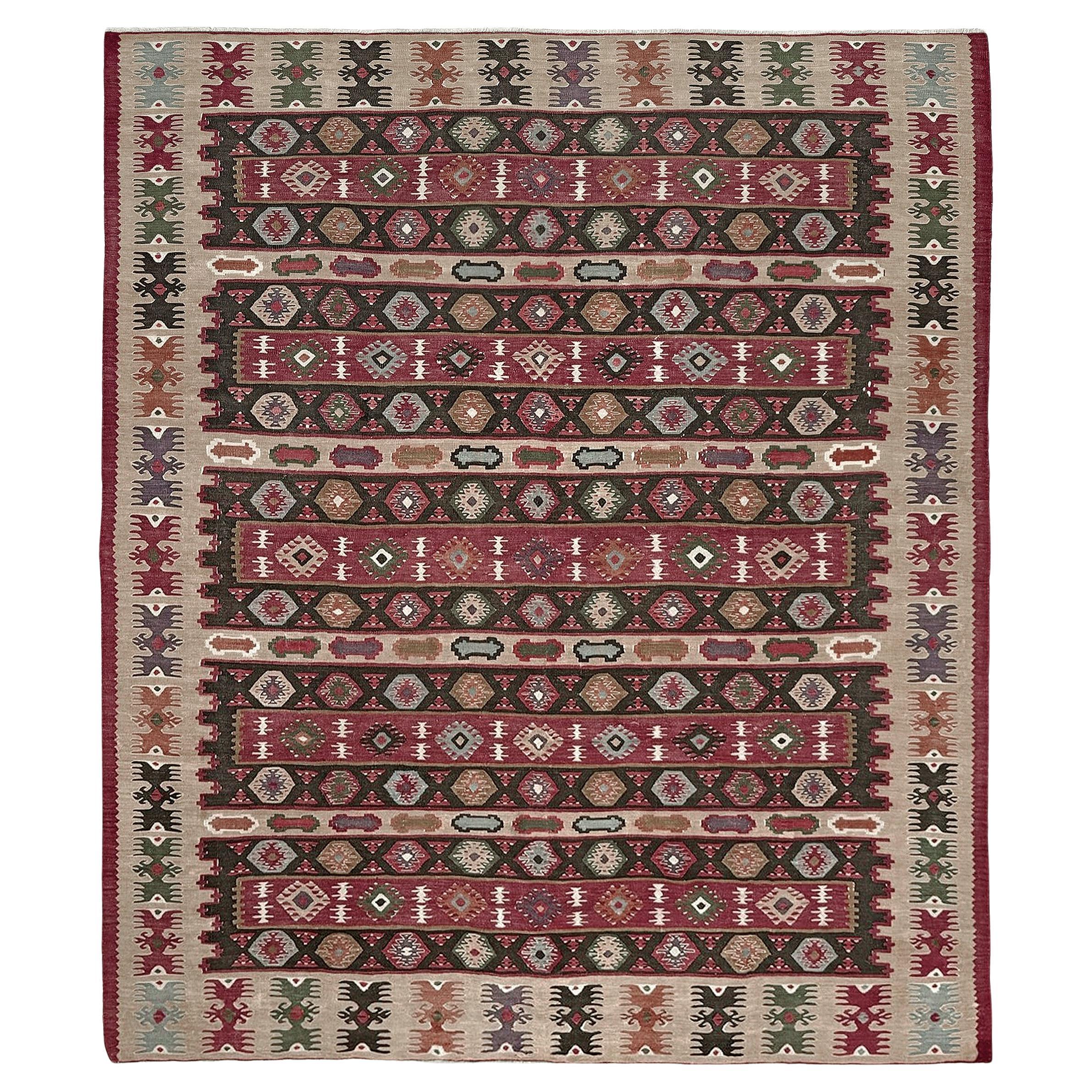 Antiker Teppich Serbisch, Handgefertigter Teppich Vintage Kilim Teppich, Geometrischer Orientteppich
