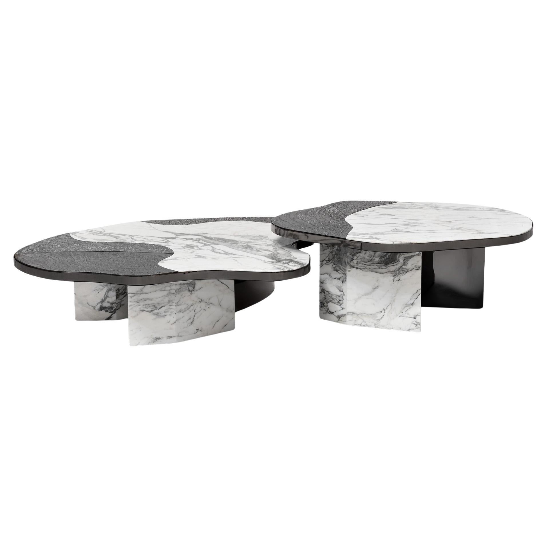 Mitteltisch aus Marmor und geschweißtem Stahl Ein tealfarben gestrichener, geschweißter Stahlsockel im Stil der französischen Industriemoderne, gekrönt von einer runden Platte aus ...