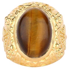 Ring aus massivem 14-karätigem Gelbgold mit einem Tigerauge in der Mitte in einem modernistischen Design. Passt am besten für einen Finger der US-Größe 11,75, misst 10,5 mm an der hö...