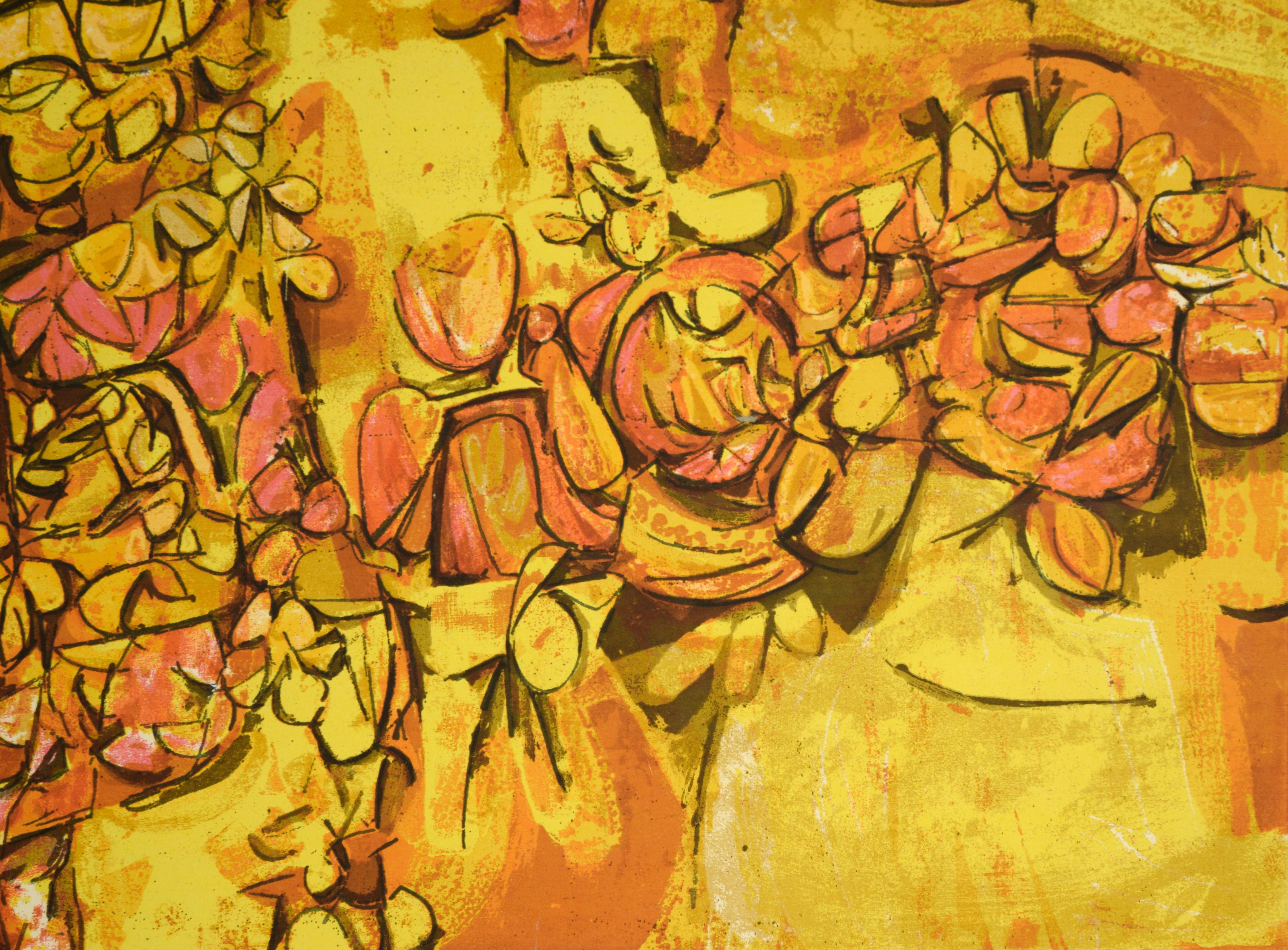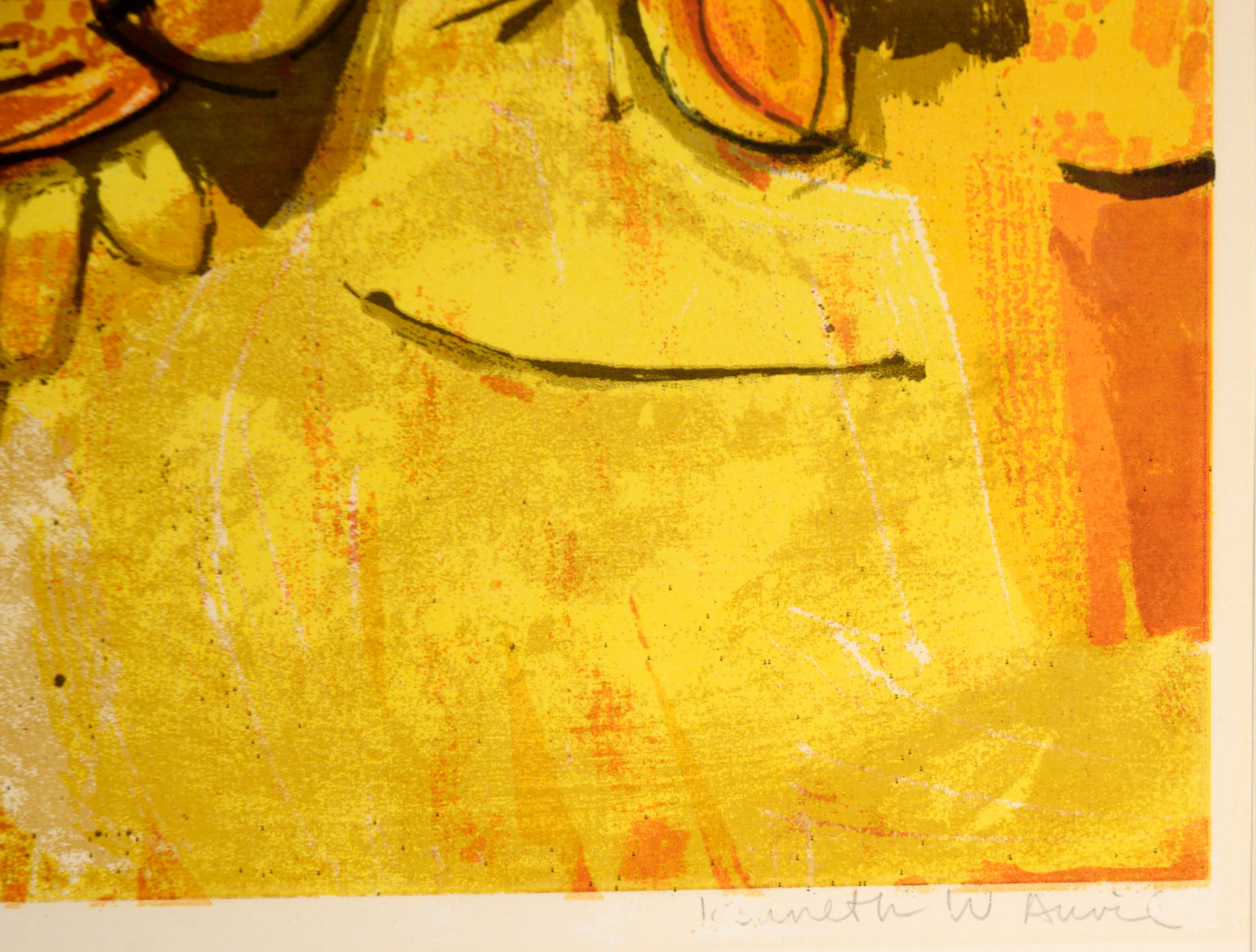 Wonderful mid-century abstract serigraph by Kenneth William Auvil (American, b. 1925.) This serigraph features botanical and floral motifs in a bright color palette of yellows and oranges, contrasted with warm reds and umbers. Throughout the piece there are clusters of shapes which are evocative of petals or leaves. Lively clusters of these shapes spill out from the center of the composition, while there are areas of visual rest found along the top and bottom, providing a sense of space and depth.