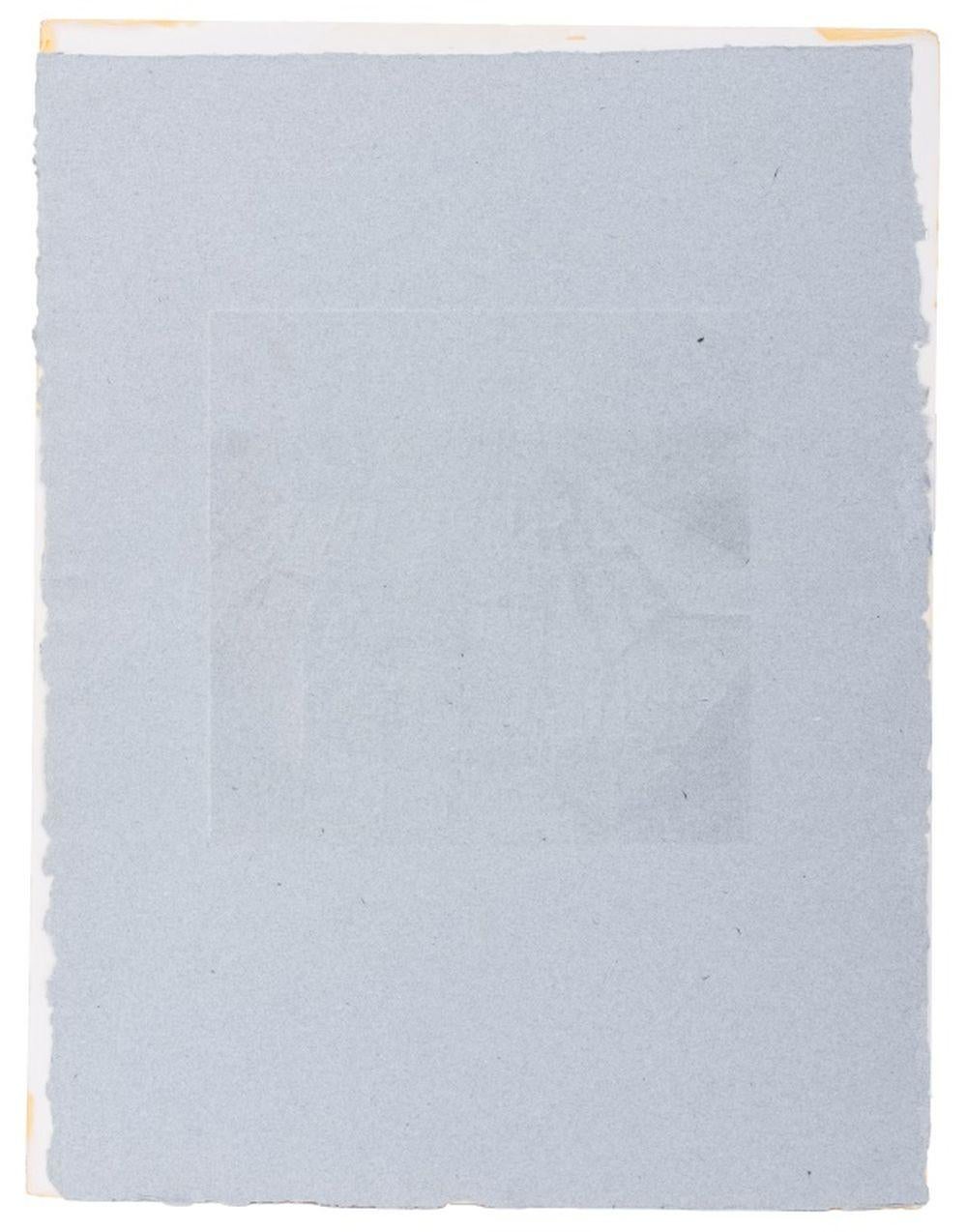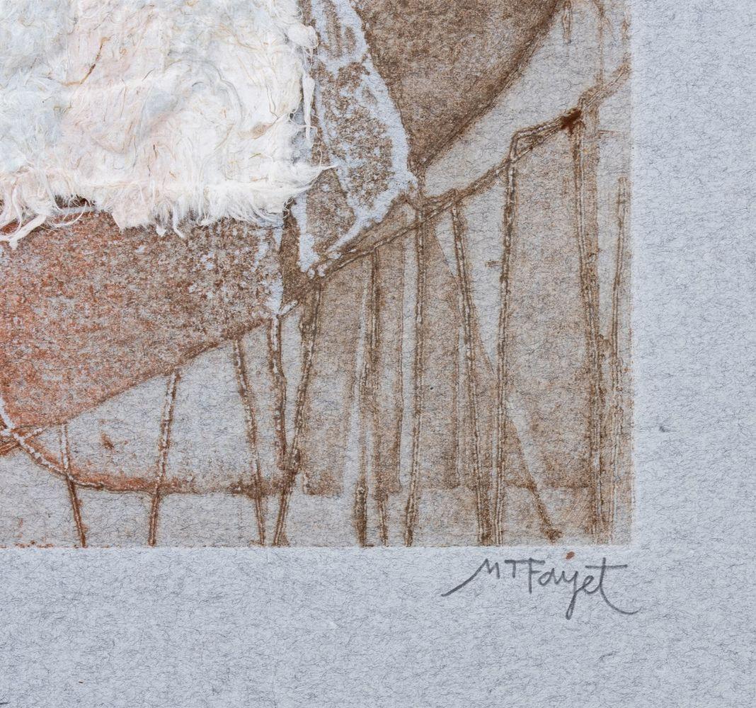 Marie-Therese Fayet (Spanierin, geb. 1934), "Force et Fragilite" [Kraft und Zerbrechlichkeit], Aquatinta in Mischtechnik auf blauem Büttenpapier, mit Bleistift signiert, betitelt und nummeriert "71/100" am unteren Rand, ungerahmt. Blatt: 29" H x 23" W. Provenienz: Aus einem Nachlass in der West 12th Street.