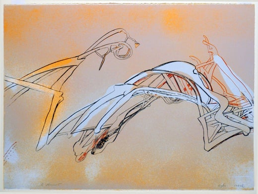 Lithographie ohne Titel, gezeichnet im Jahr 2022 und veröffentlicht in einer Auflage von 43 Exemplaren. Das 36 mal 25 Zentimeter große Werk ist links unten mit der Nummer 9 von 43 bezeichnet und rechts unten mit Bleistift "R Hunt" signiert.