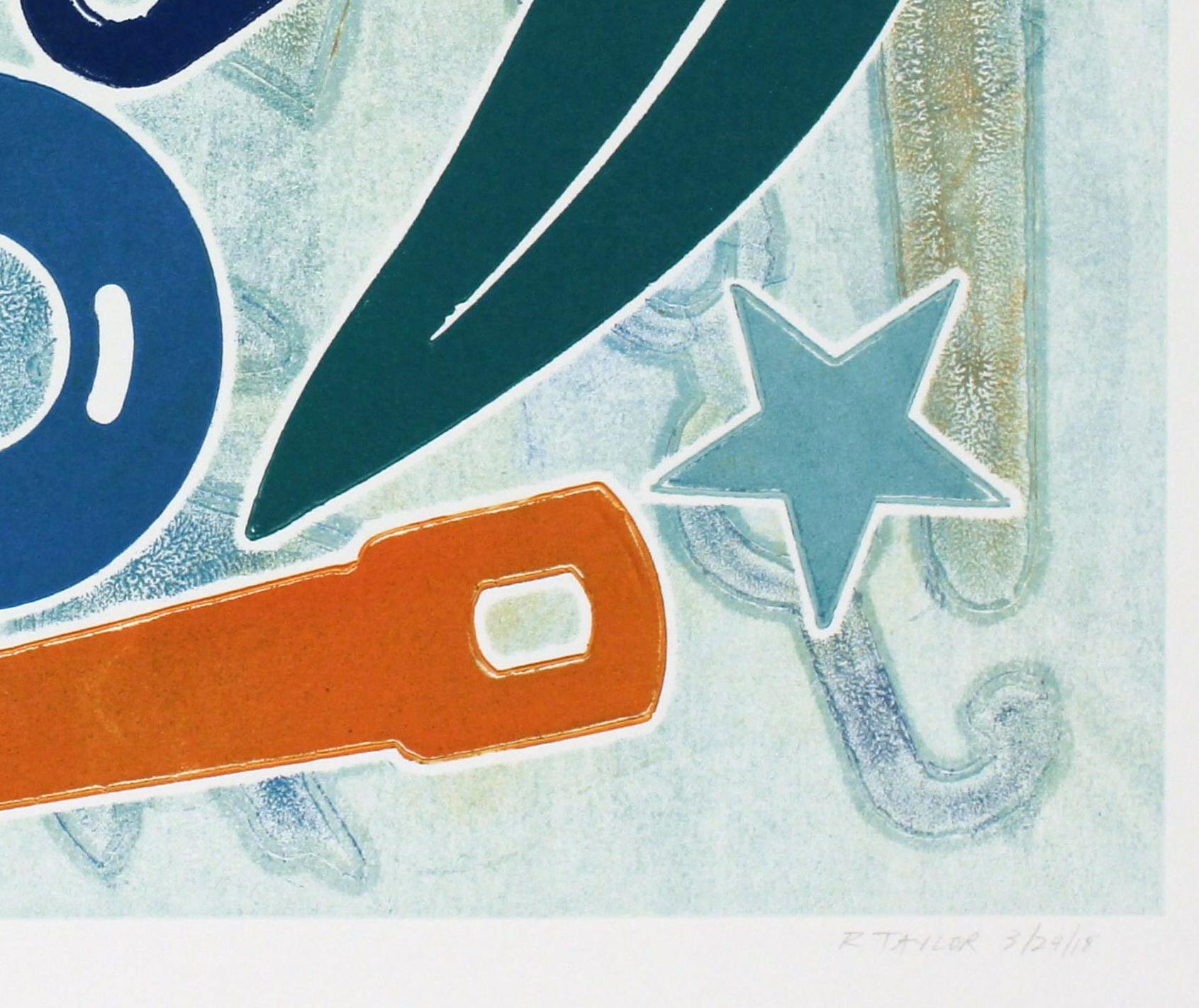 " Jazz 187" This unique mono print is from my Jazz series, where each individual image is composed from shapes of found objects. My process of printing is one of improvising, much like a jazz musician improvises over the chords of a tune. In this case, I improvised on the printing press using shapes I have collected from walks and journeys around the world. The palette changes from print to print, as well as the depth of the background, with some being white and others an array of colors. All prints are either on 300 lb Arches paper or Rives BFK, both of which are the gold standard of fine art printing paper. Each print is numbered "1/1" to reflect its unique character, and is signed and dated.