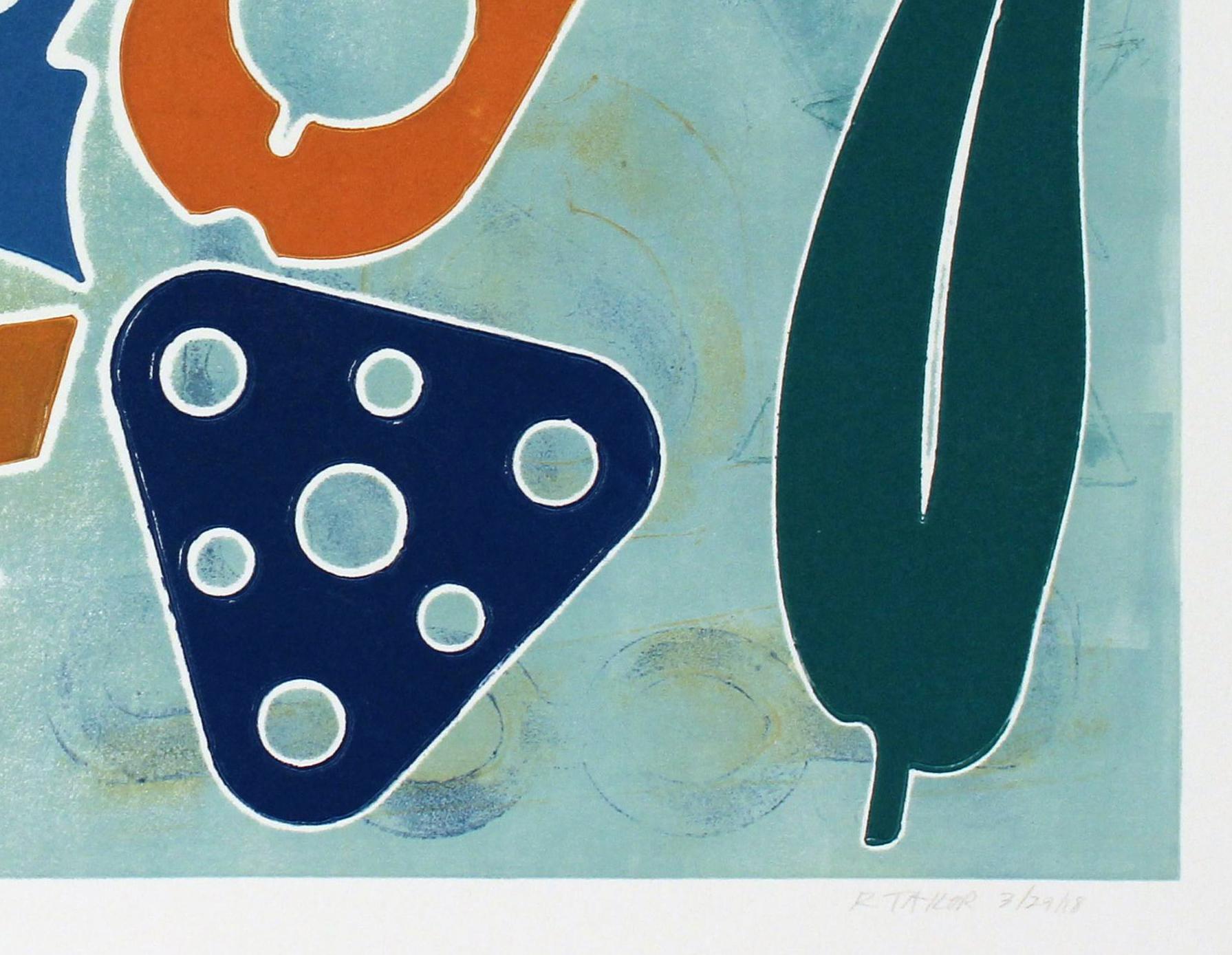 "Jazz 188" Dieser einzigartige Monodruck stammt aus meiner Jazz-Serie, bei der jedes einzelne Bild aus den Formen gefundener Gegenstände zusammengesetzt ist. Mein Druckprozess ist ein Prozess der Improvisation, ähnlich wie ein Jazzmusiker über die Akkorde einer Melodie improvisiert. In diesem Fall habe ich auf der Druckmaschine improvisiert und Formen verwendet, die ich auf meinen Spaziergängen und Reisen rund um die Welt gesammelt habe. Die Palette ändert sich von Druck zu Druck, ebenso wie die Tiefe des Hintergrunds, wobei einige weiß sind und andere eine Reihe von Farben aufweisen. Alle Drucke werden entweder auf 300 lb Arches-Papier oder Rives BFK gedruckt, die beide den Goldstandard für Kunstdruckpapier darstellen. Jeder Druck ist mit der Nummer "1/1" versehen, um seinen einzigartigen Charakter widerzuspiegeln, und ist signiert und datiert.