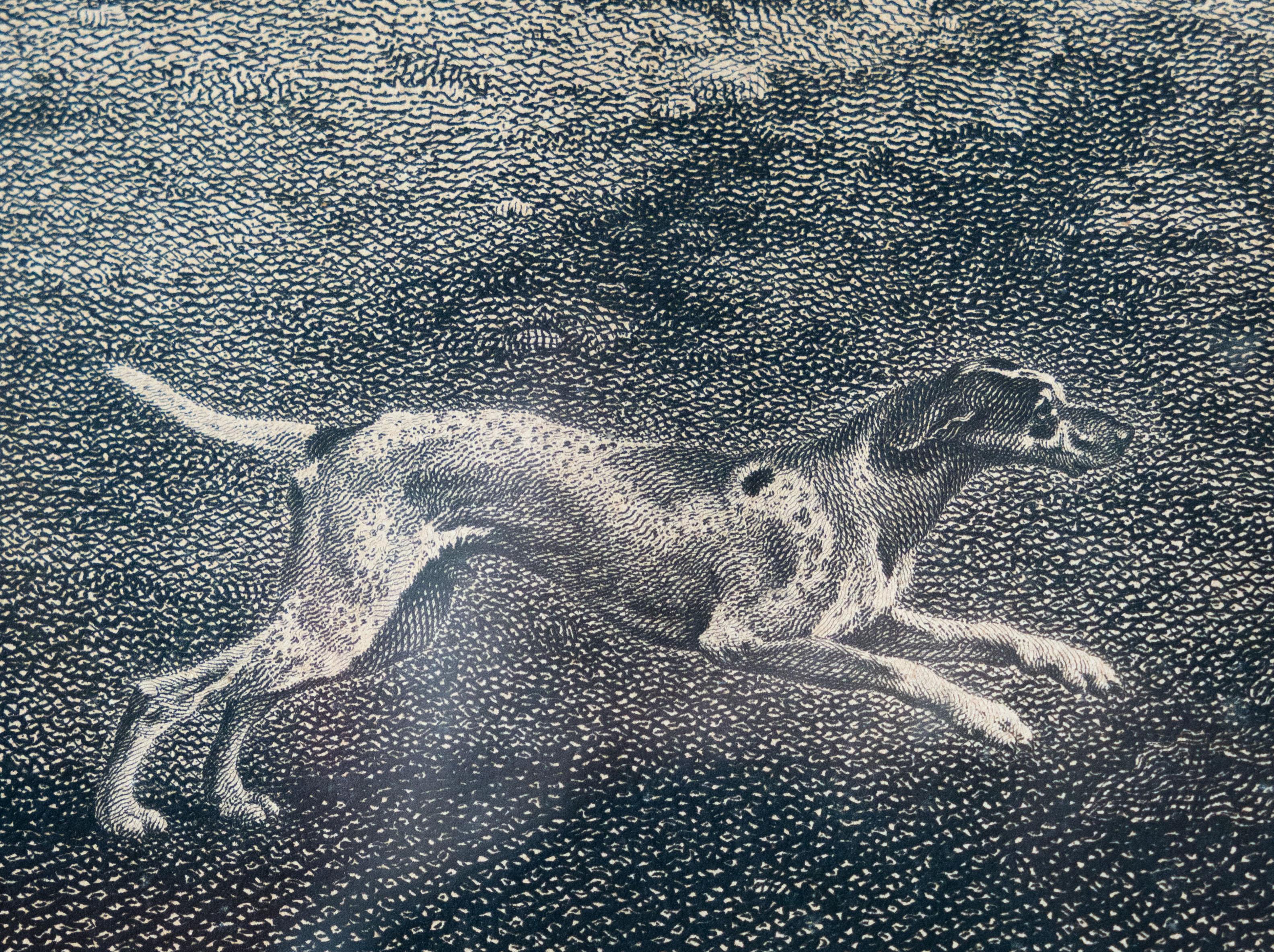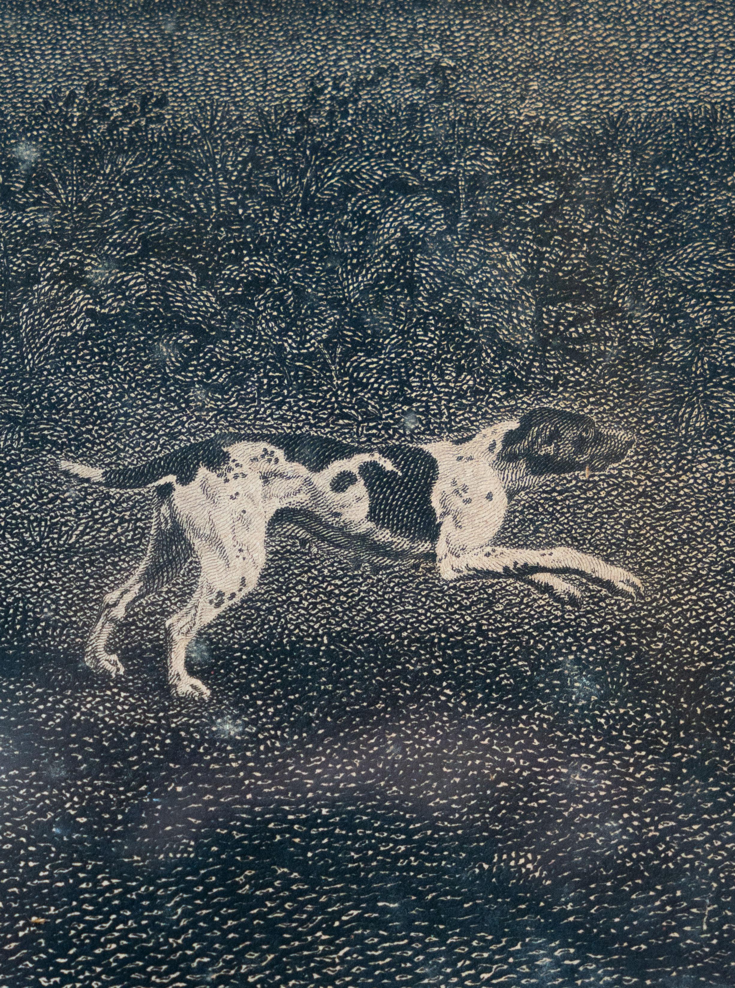 Recto, bottom right: See Lan and Flora range the late shorn plain / Where Game abounds they seldom hunt in vain / By Instinct strongly urg’d each try around, / Now snuff the Air, now scent the tainted Ground