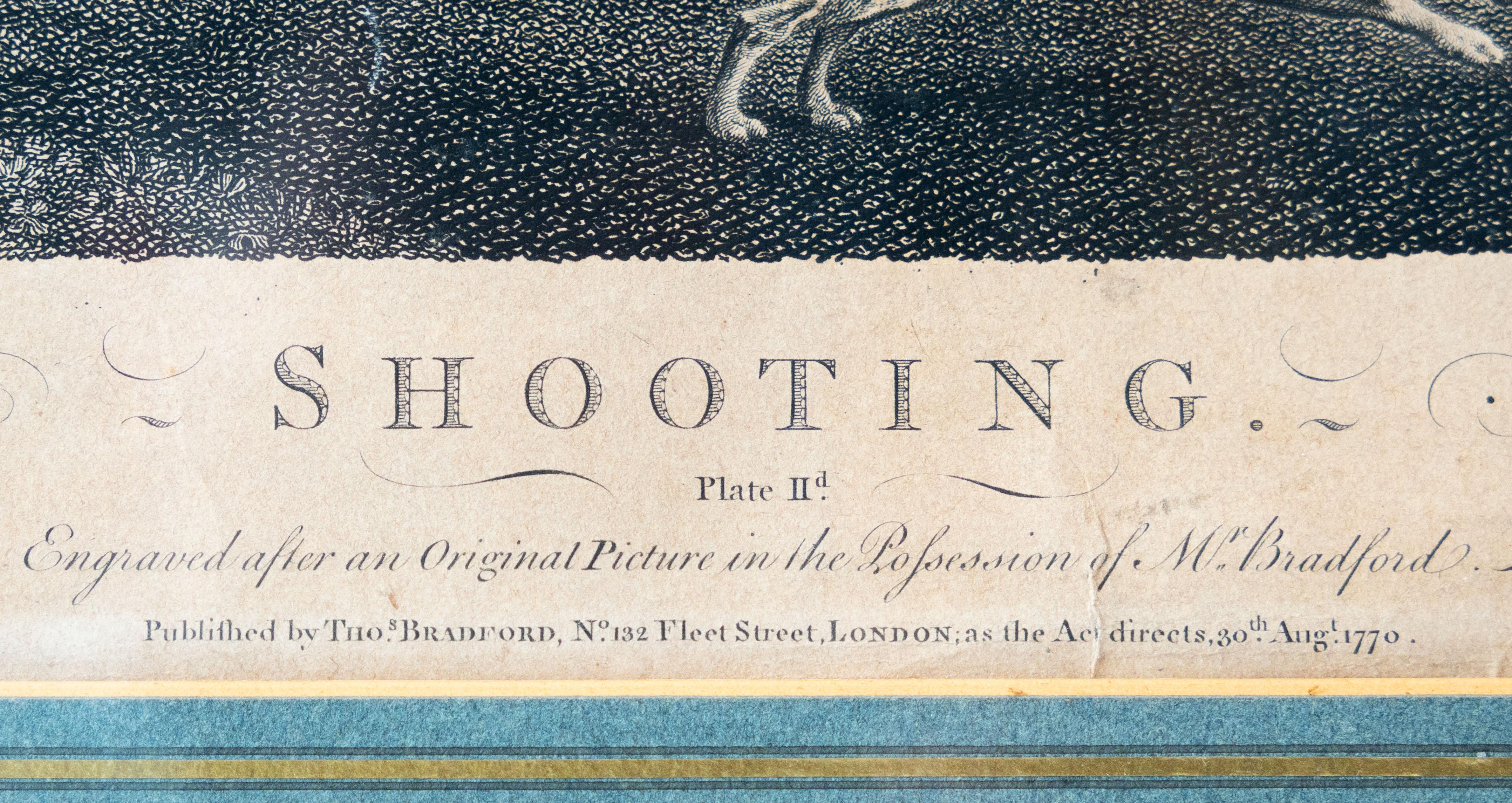 Recto, bottom center: SHOOTING. / Plate IId / Engraved after an Original Picture in the Possession of Mr Bradford/ Published by THOs BRADFORD, No 132 Fleet Street, LONDON; as the Act directs 30th Augt 1770