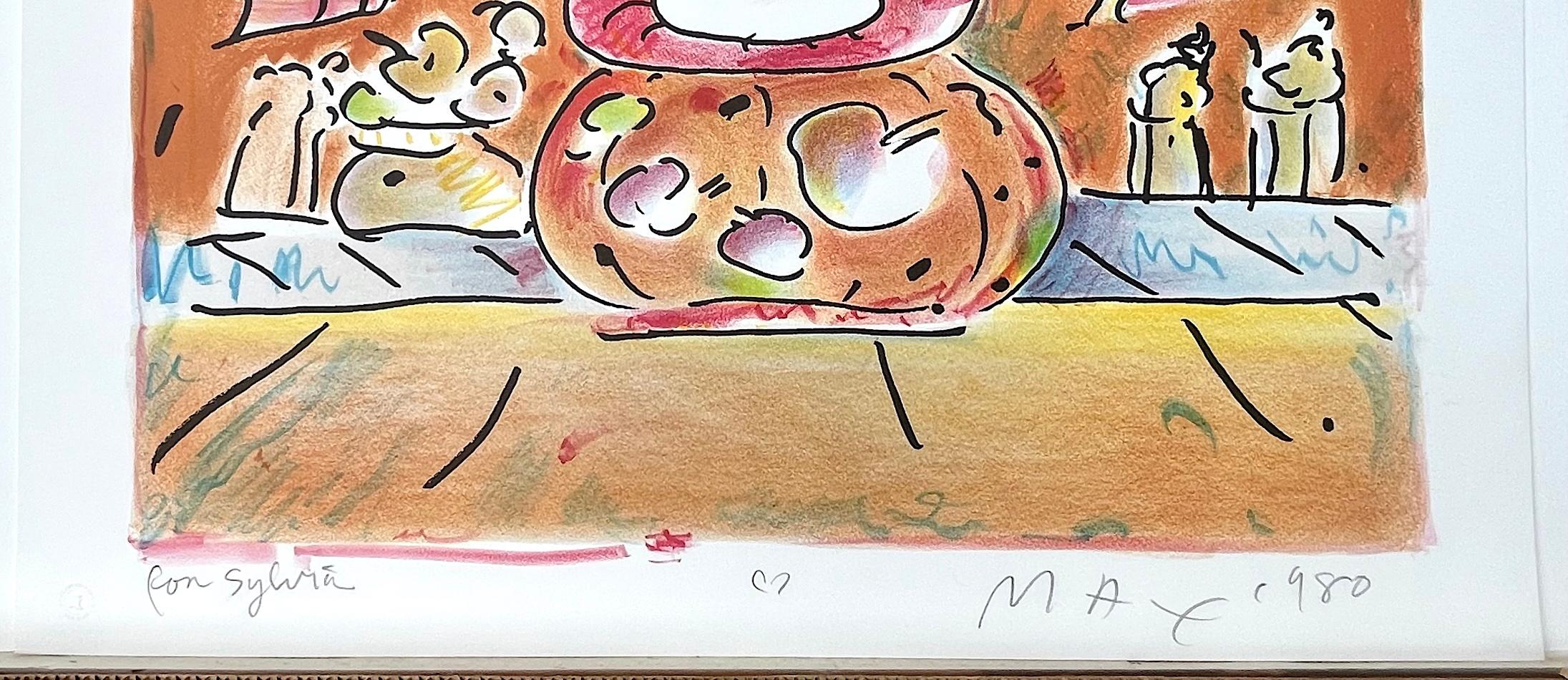 - Zustand:Ausgezeichneter Zustand, ungerahmt, nie aufgezogen, mit schwarzem Filzstift signierter und datierter Printers Proof mit persönlicher Dedic von Peter Max, abgesehen von der Auflage von 165. Aus der Privatsammlung des Druckermeisters.