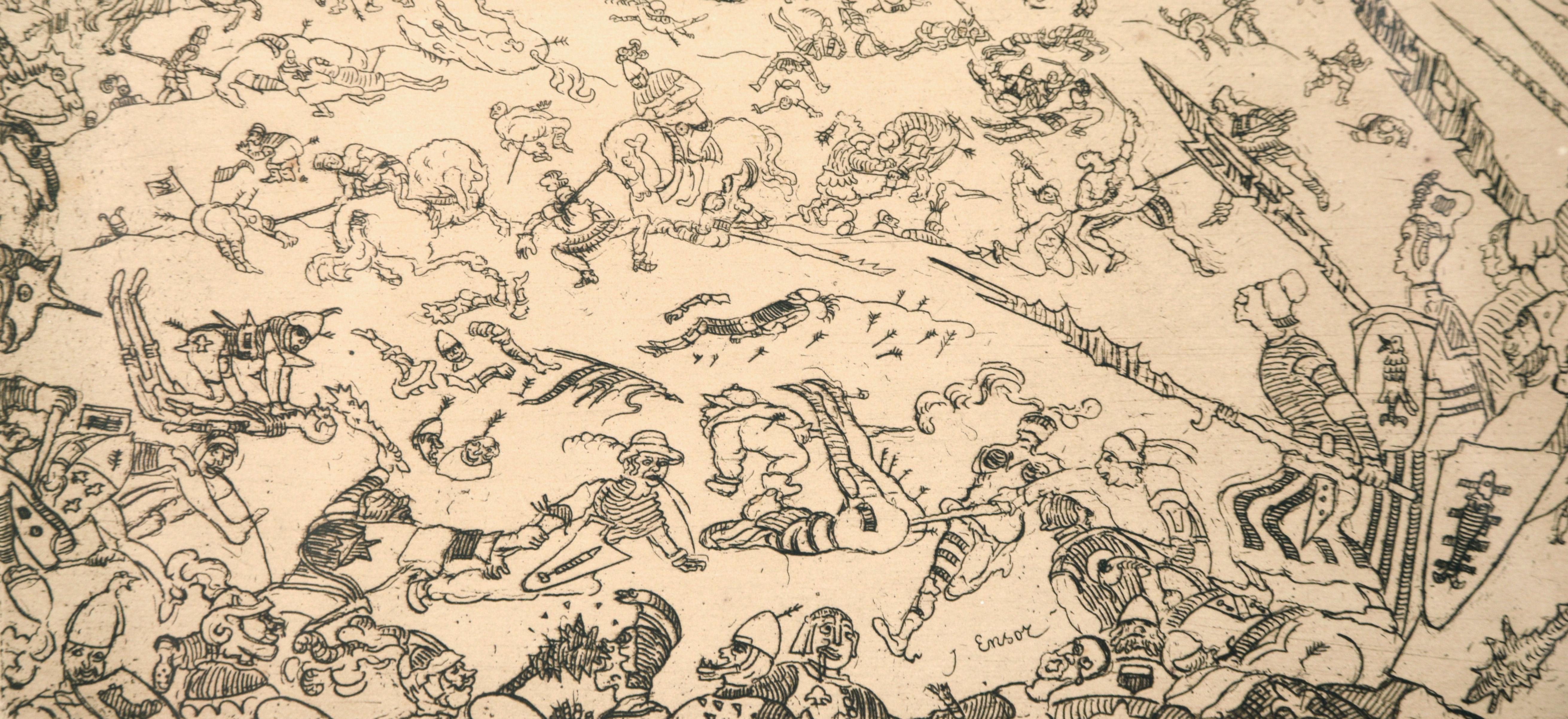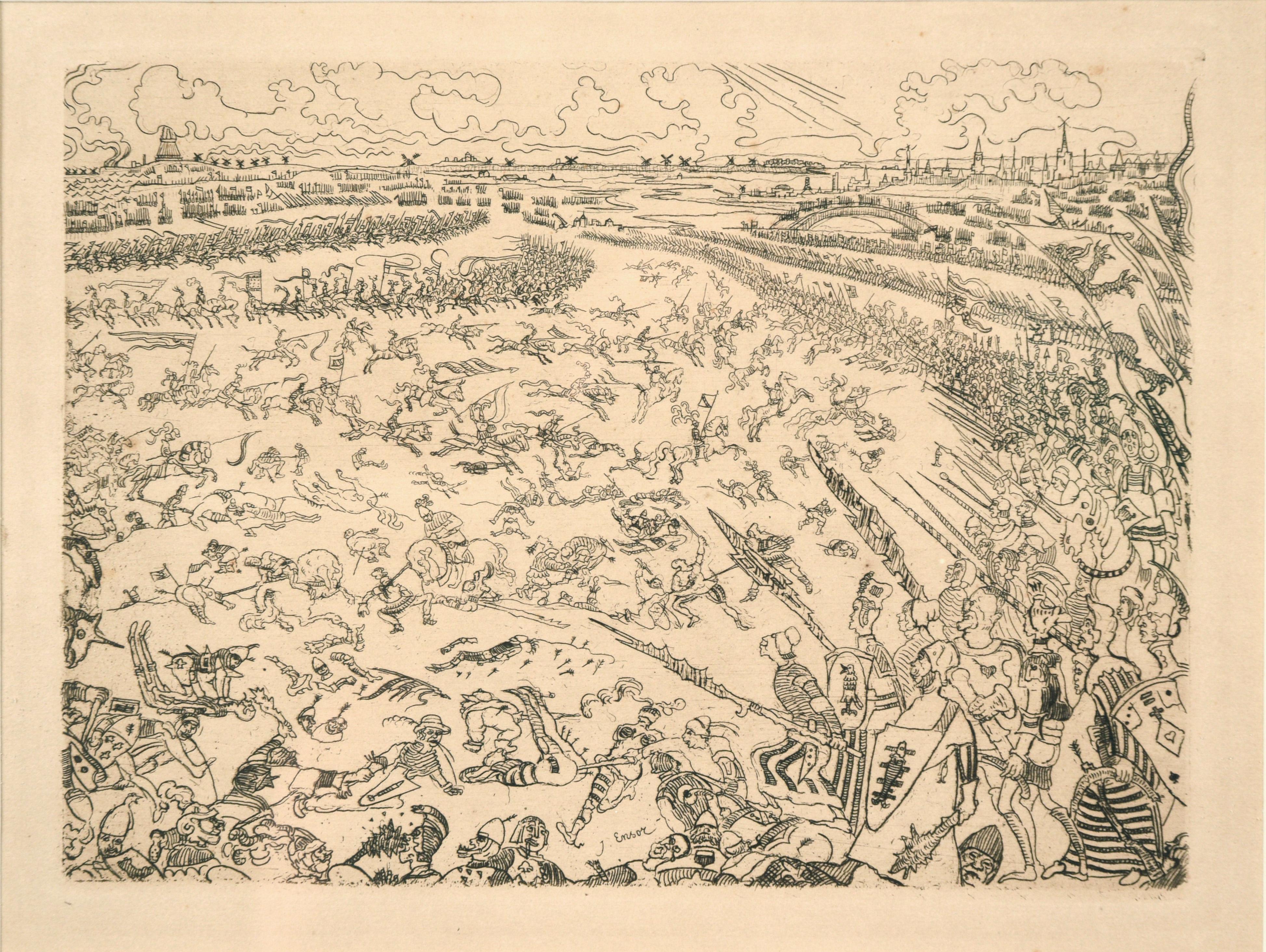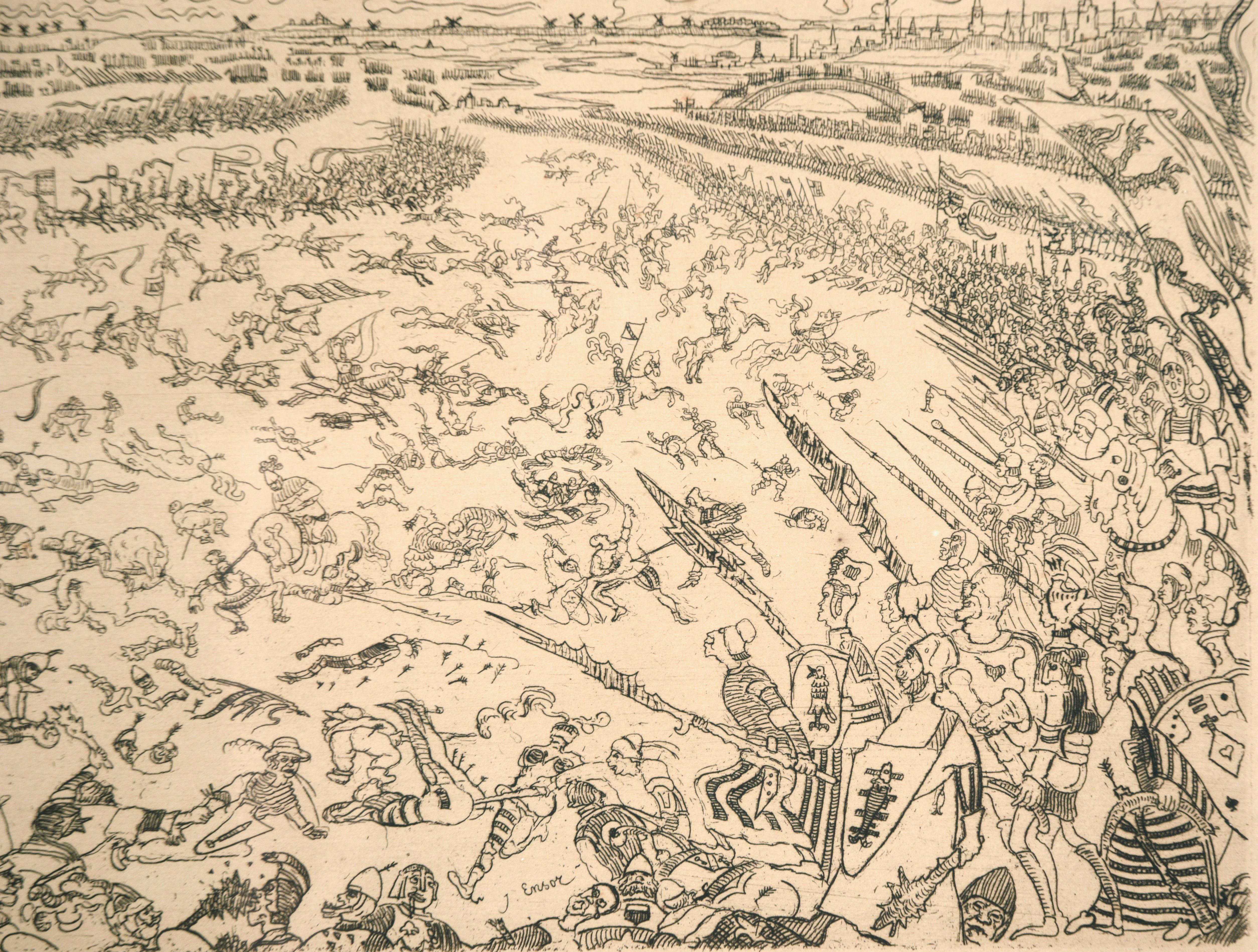 "Die Schlacht der Goldenen Sporen" Avant Garde Druck Dieser Druck der gewaltigen "Bataille des Éperons d'Or" (Schlacht der Goldenen Sporen) gilt als einer der wichtigsten Drucke von Jame's Ensor (Belgier, geb. 1860, gest. 1949) mit gewaltigen Szenen. Der Druck stellt die Schlacht des französisch-flämischen Krieges von 1302 dar, nach der er benannt ist und in der die aufständischen Flamen einen unerwarteten Sieg über die Franzosen errangen. Die Flamen mit ihrer hechtschwingenden Infanterie sind im Vordergrund zu sehen, während das Schlachtfeld mit gefallenen französischen Kavalleristen übersät ist. Dieser Druck ist ein hervorragendes Beispiel für Ensors bizarren und manchmal grotesken Umgang mit seinen Motiven. Viele der Figuren wirken verzerrt, und der Druck schreckt auch nicht vor unverhohlener und fast schon komischer Gewalt zurück: Körperteile liegen auf dem Feld verstreut, Menschen werden mit Spießen durchbohrt und mit Streitkolben ins Gesicht geschlagen. Der größte Teil des Werks ist mit einfachen Linien und wenig oder gar keinen Kreuzschraffuren und Schattierungen ausgeführt, was dem Werk einen modernen Charakter verleiht und auf Ensors Stellung als wichtiger Vorreiter des Expressionismus und der Avantgarde des 20. Jahrhunderts hinweist. Rahmengröße: 15,5" H x 17,75" W Größe der Matte: 14.63" H x 16.63" W Papierformat: 9,75" H x 12,63" W Signiert "Ensor" auf der Platte, wahrscheinlich aus der Auflage des Delteil-Katalogs von 1925, wenn man das Alter und die Bindung des Papiers bedenkt. Provenienz: Enthält Galerie-Etiketten von früheren Ausstellungen in der Aronson Gallery in Atlanta, Georgia; der Washington D.C. National Armory im Jahr 1979 und die Crossroads Gallery in Fullerton, Kalifornien. James Ensor wurde 1860 in Ostende, Belgien, geboren. Seine Eltern betrieben ein Souvenirgeschäft, in dem er einen Großteil seiner Kindheit verbrachte und sich von Gegenständen wie den Karnevalsmasken, die seine Eltern verkauften, inspirieren ließ. Ensor hatte wenig Interesse an einer akademischen Ausbildung und beschloss mit fünfzehn Jahren, sich von lokalen Malern ausbilden zu lassen, anstatt eine traditionelle Schule zu besuchen. Von 1877 bis 1880 besuchte er die Académie Royale des Beaux-Arts in Brüssel. Nach der Schule unterhielt er ein Studio auf dem Dachboden seines Elternhauses und reiste nur selten, und obwohl er seine Kunst ausstellte, wurde sie oft kritisiert oder als skandalös angeprangert. Gegen Ende des 19. Jahrhunderts begann er, mehr Anerkennung zu finden, und der Ankauf seines Werks "Der Lampenjunge" von 1880 durch das Königliche Museum der Schönen Künste in Brüssel im Jahr 1895 markierte einen Wendepunkt in seiner Karriere. Kurz darauf hatte er seine erste Einzelausstellung in Brüssel und stellte auch in den frühen 1900er Jahren immer wieder aus, obwohl er sich in der zweiten Hälfte seines Lebens lieber der Musik widmete. Er blieb während des Zweiten Weltkriegs in Ostende und starb dort 1949 an den Folgen einer Krankheit. Ensors Gemälde sind bekannt für ihre bizarren Motive und leuchtenden Farben, darunter Skelette, Puppen und seltsame Masken, aber auch für religiöse Themen und politische Kommentare. Werke wie "Der Einzug Christi in Brüssel 1889", das wegen seiner Umstrittenheit erst 1929 ausgestellt wurde, gelten heute als wichtige Vorläufer der expressionistischen Bewegung. Ensors Kunst befindet sich in bedeutenden Sammlungen auf der ganzen Welt, wie dem Museum of Modern Art in New York, dem Getty Museum in Los Angeles und dem Königlichen Museum der Schönen Künste Antwerpen.