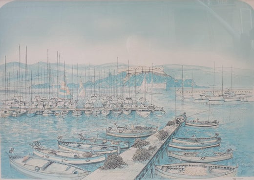 Objekte ähnlich wie Antike Antibes Azur Coast Hafenboote Große Lithografie RAFFLEWSKI Polnischer Künstler 20. Jahrhundert