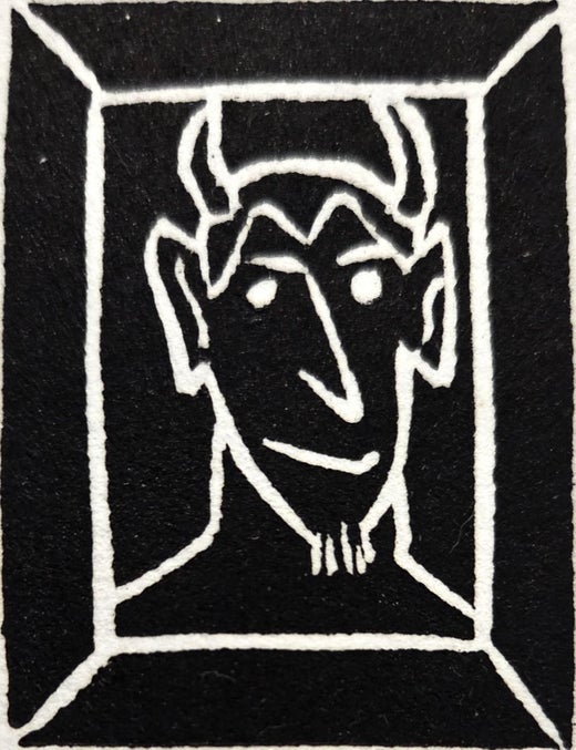Devil Chicken Dinner /// Zeitgenössischer lustiger Linolschnitt Schwarzer und weißer Mann