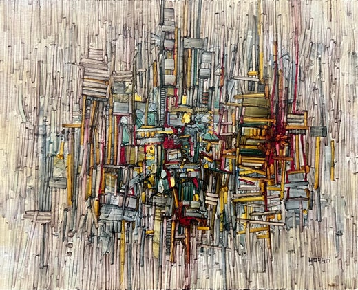 Ahmed Yousrys Hauptaugenmerk in seiner Malerei liegt seit jeher auf seiner Fähigkeit, sich darauf zu konzentrieren, mit seinem bevorzugten Medium, Acrylfarben und Tinte auf Karton, seine fesselnden Visionen von urbanen Behausungen und Superorganismen zu schaffen, die die konstante Grundlage seines kompositorischen Stils bilden. Yousrys Kunst basiert auch auf seiner Unzufriedenheit mit den philosophischen Realitäten und gesellschaftlichen Normen der heutigen Zeit, und er erforscht entschlossen die materielle Kontrolle und den Mangel an menschlicher Substanz, den er in der Welt um uns herum sieht. Sein Stil ist eigentlich eine meditative Verschmelzung verschiedener Ausdrucksmethoden in einer metaphysischen Weise, die auf der Praxis der Improvisation beruht, zu der er sich beim Malen immer hingezogen fühlte.