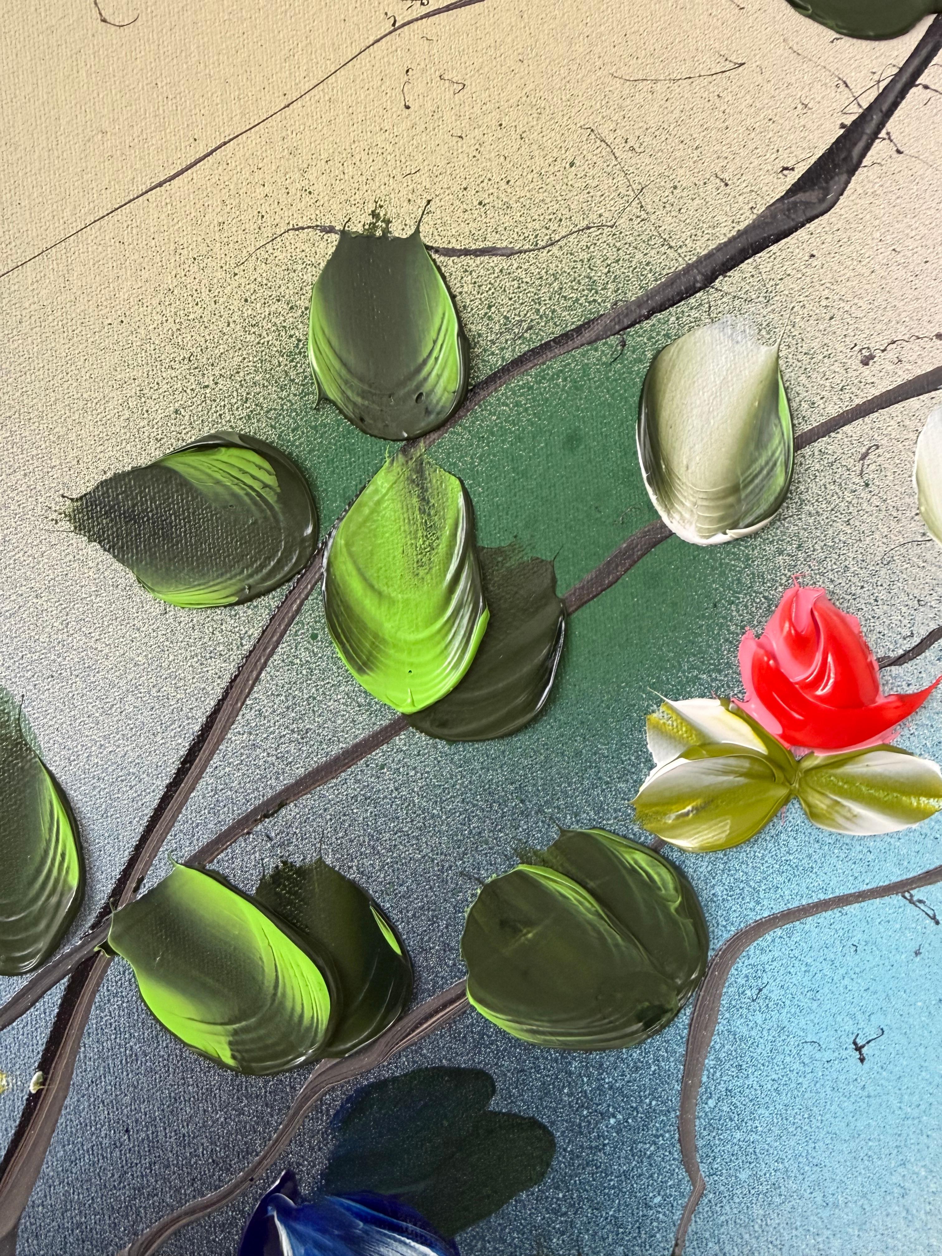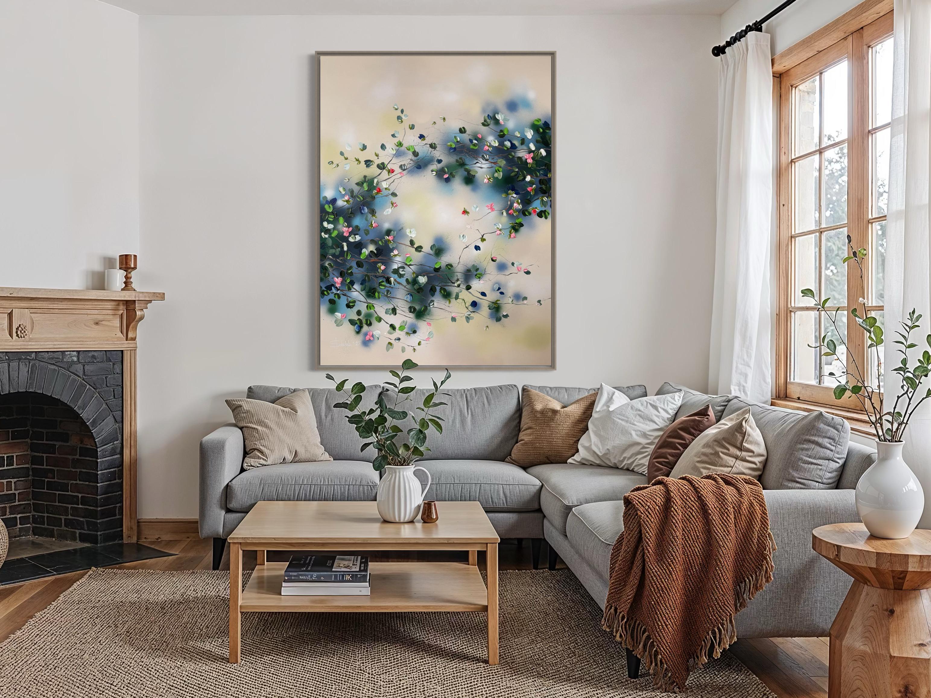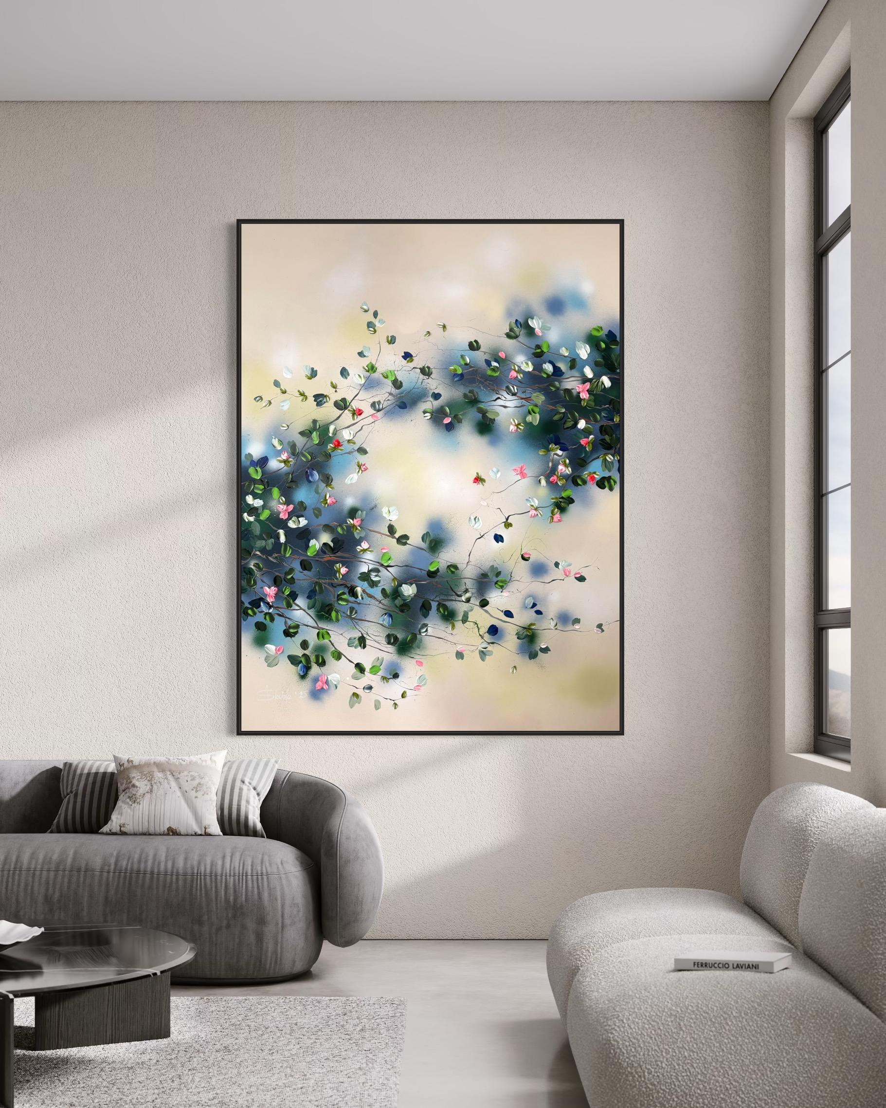 Das Werk vermittelt einen sanften Rhythmus, als ob sich die Zweige in einer ruhigen Gartenbrise wiegen würden - eine visuelle Metapher für Ruhe und Erneuerung. Mit einem Spachtel werden die Blüten in strukturierten Schichten aufgebaut, wodurch eine skulpturale Tiefe vor dem sanft gemischten Hintergrund aus Beige, Blau und Grün entsteht. Diese Kombination aus Abstraktion und modernem floralen Ausdruck verleiht der Oberfläche Harmonie und Lebendigkeit.