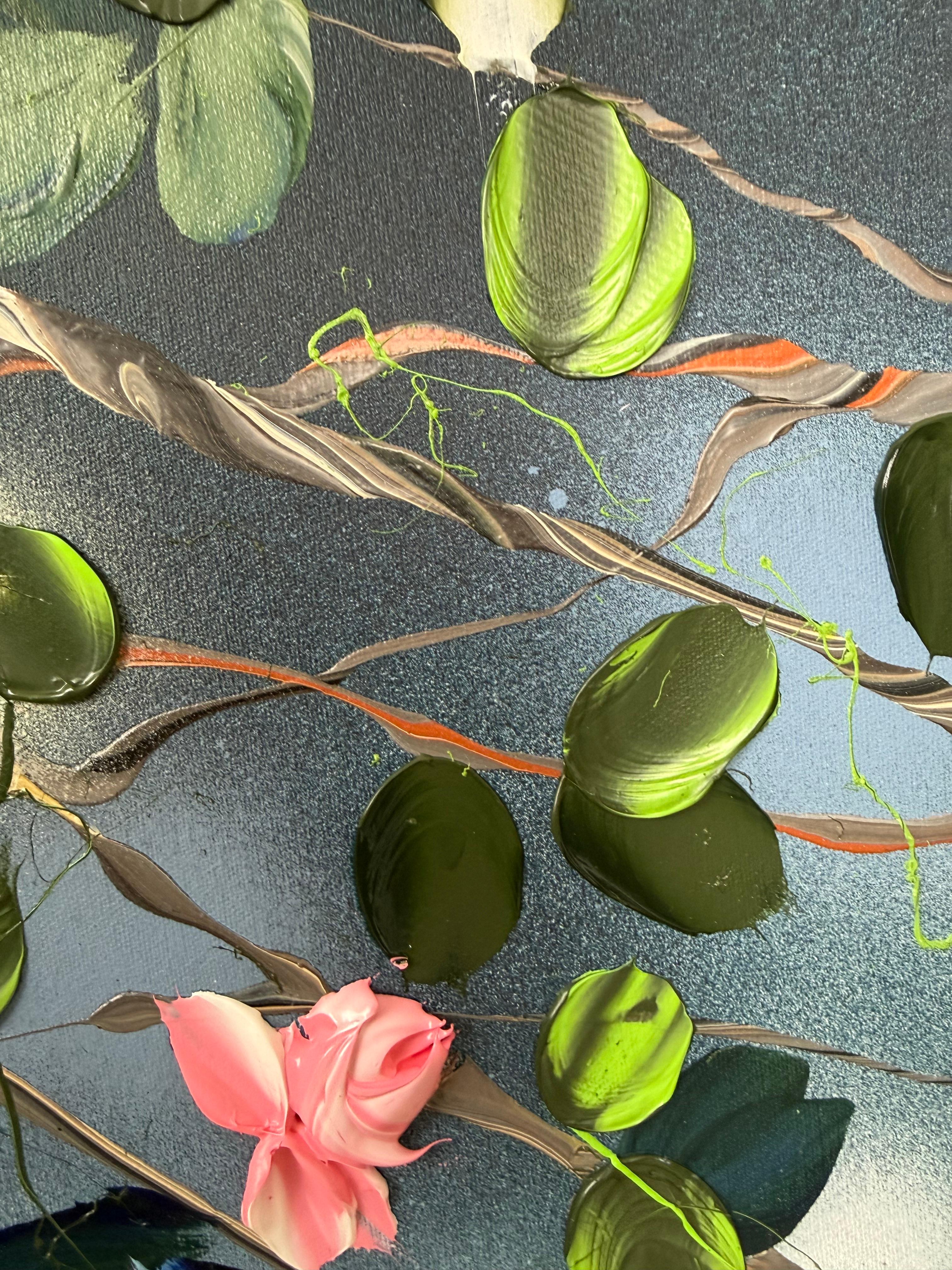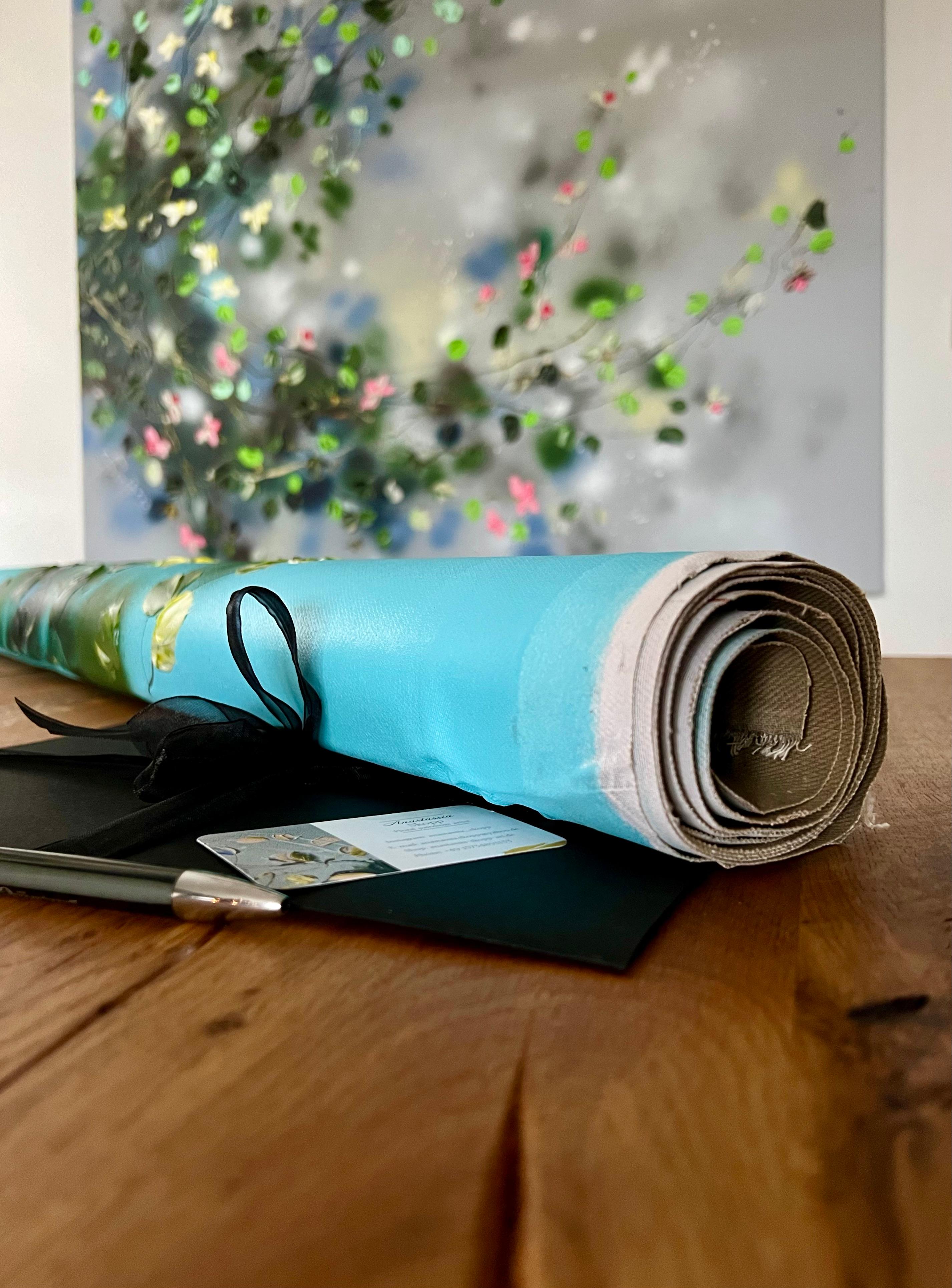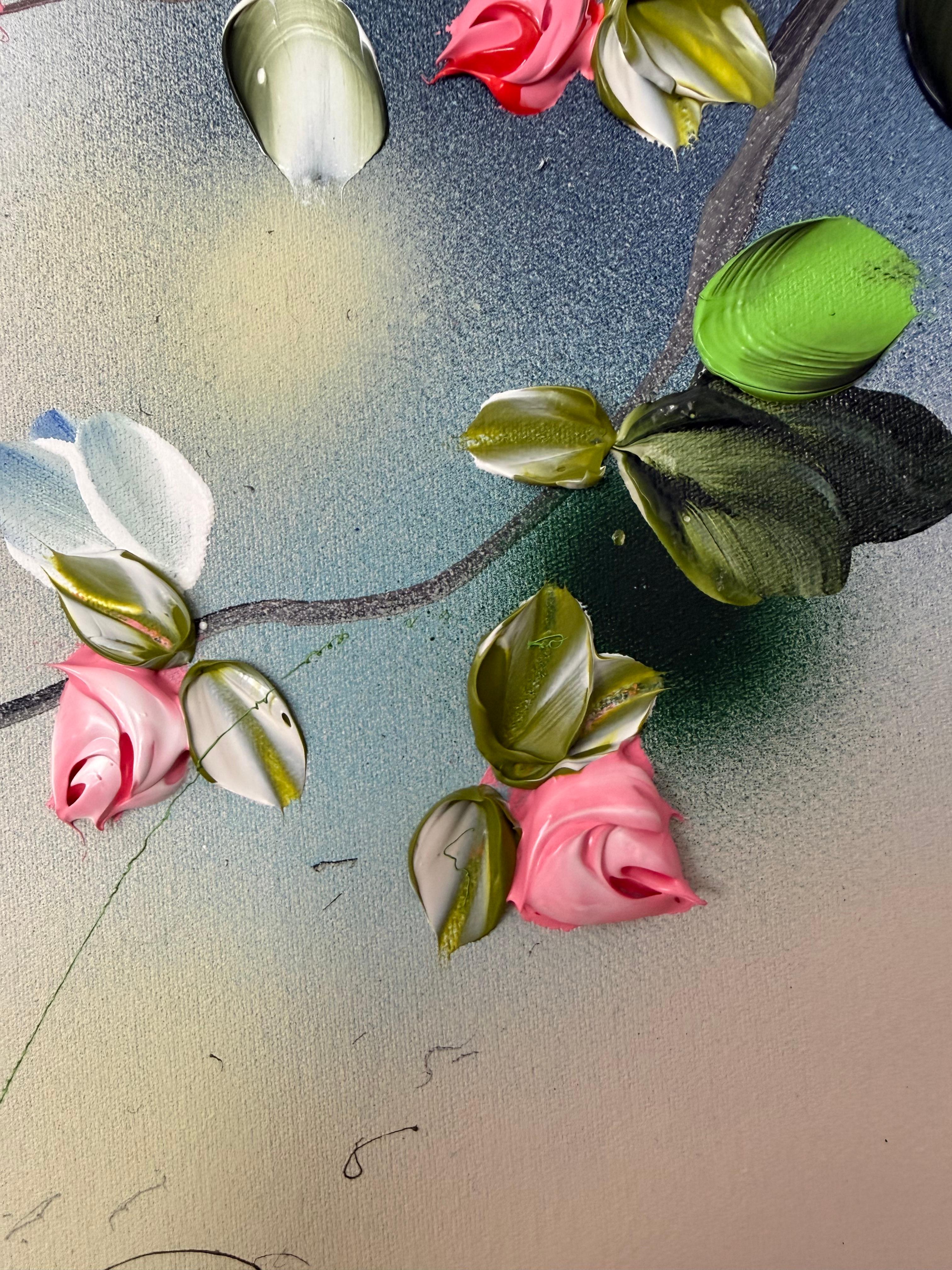 Das Werk vermittelt einen sanften Rhythmus, als ob sich die Zweige in einer ruhigen Gartenbrise wiegen würden - eine visuelle Metapher für Ruhe und Erneuerung. Mit einem Spachtel werden die Blüten in strukturierten Schichten aufgebaut, wodurch eine skulpturale Tiefe vor dem sanft gemischten Hintergrund aus Beige, Blau und Grün entsteht. Diese Kombination aus Abstraktion und modernem floralen Ausdruck verleiht der Oberfläche Harmonie und Lebendigkeit.