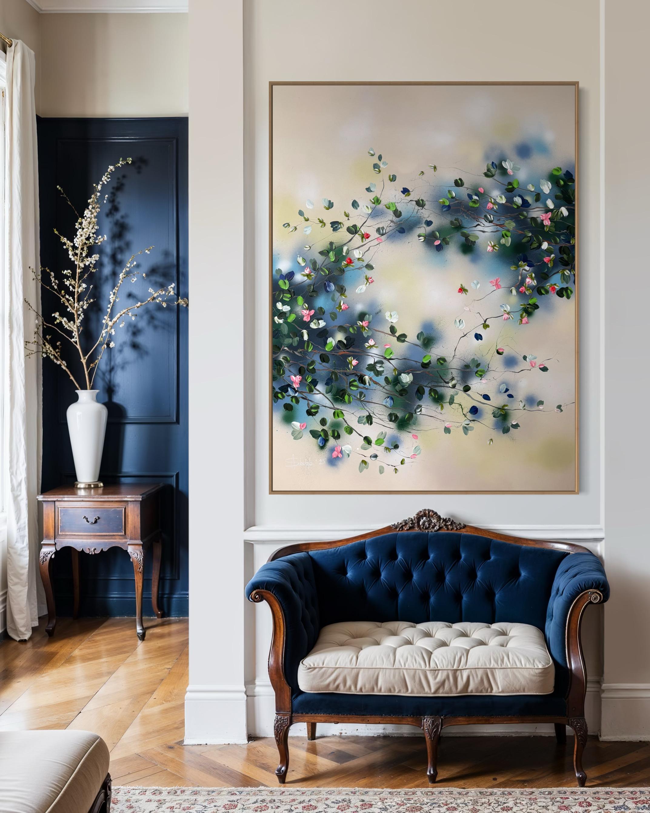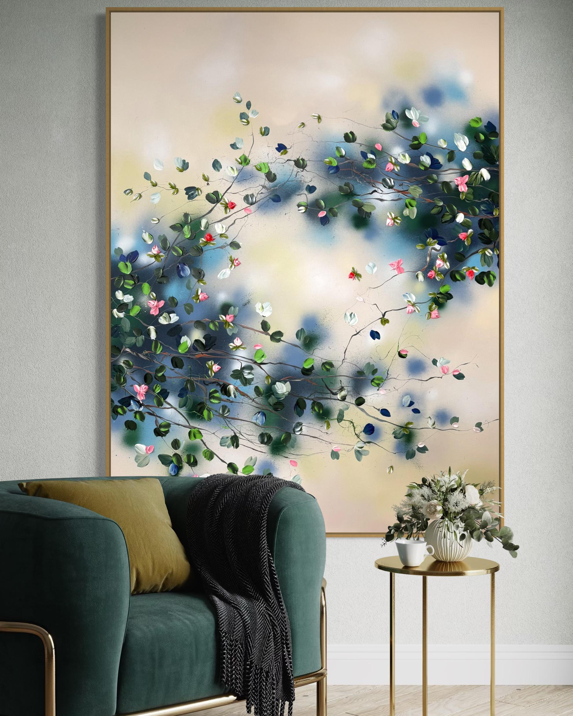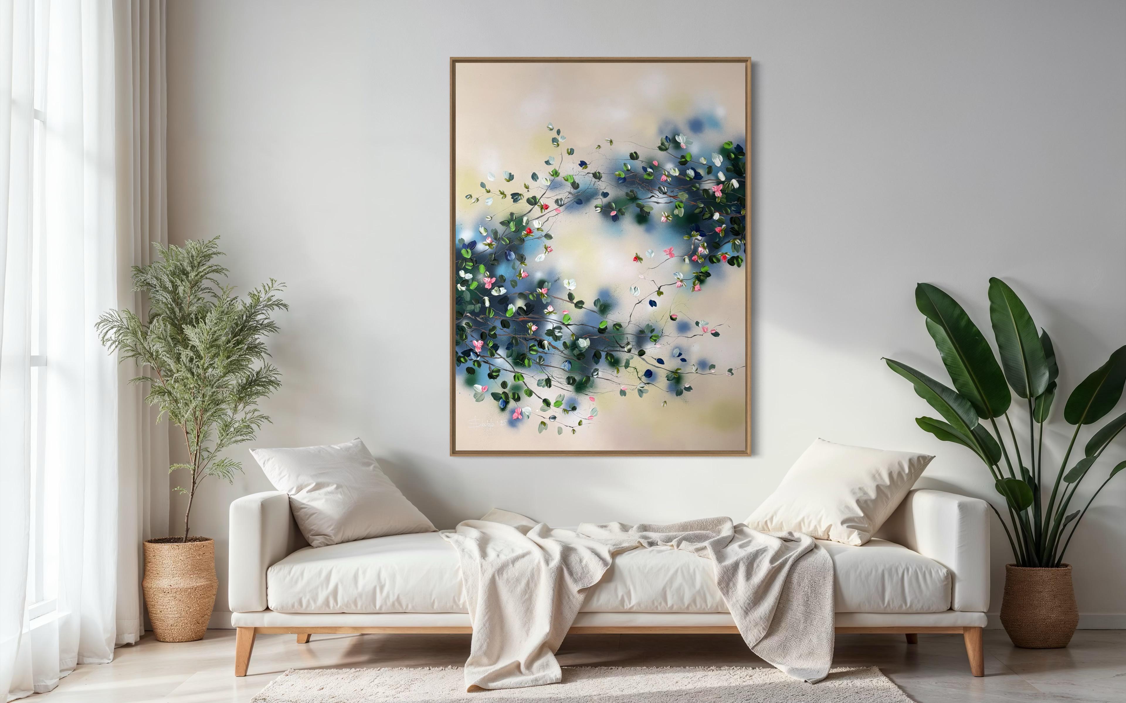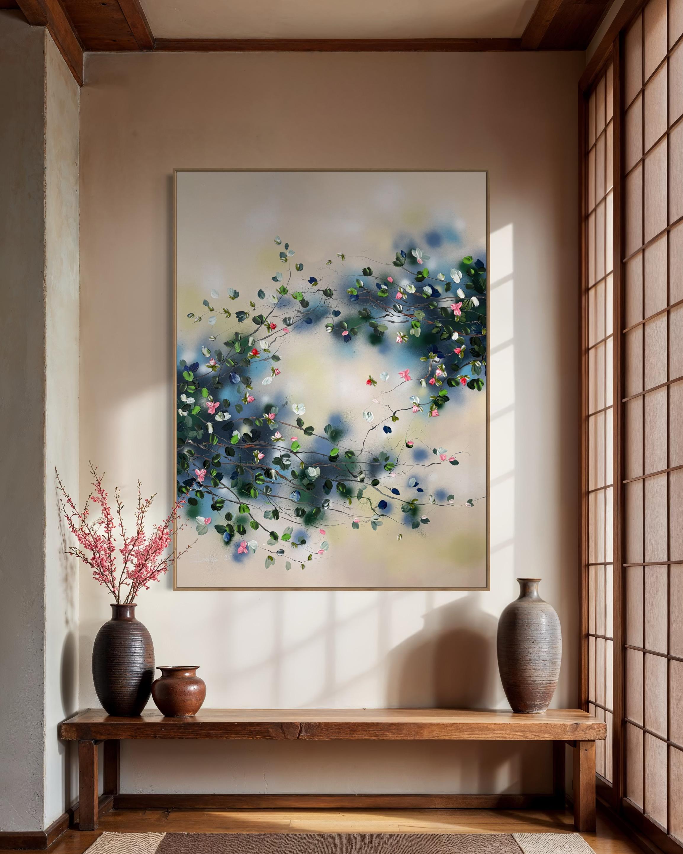 Calm Garden vermittelt Gelassenheit und Ausgeglichenheit durch ein Zusammenspiel aus sanften Tönen und strukturierten Blüten. Auf Leinwand gemalt (134 × 174 cm, auf Keilrahmen 120 × 160 cm), entfaltet sich die Komposition mit zarten Zweigen, die Blüten in Rosa-, Weiß-, Tiefblau- und frischen Grüntönen tragen.