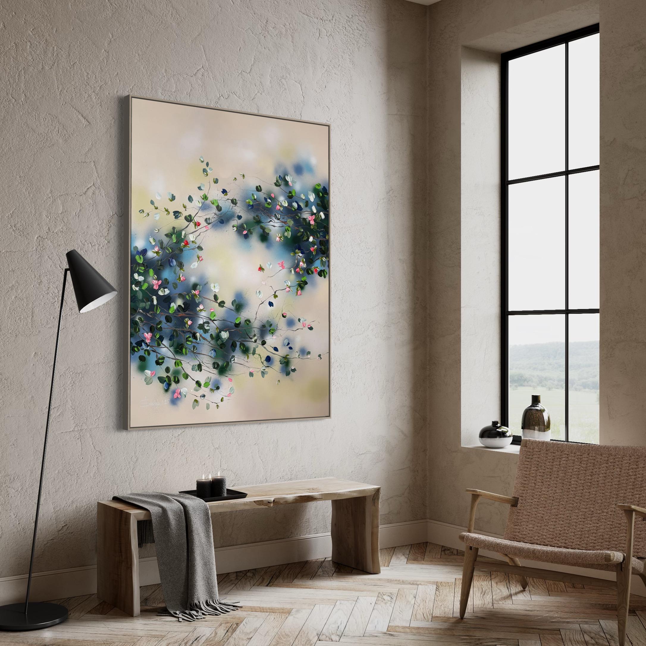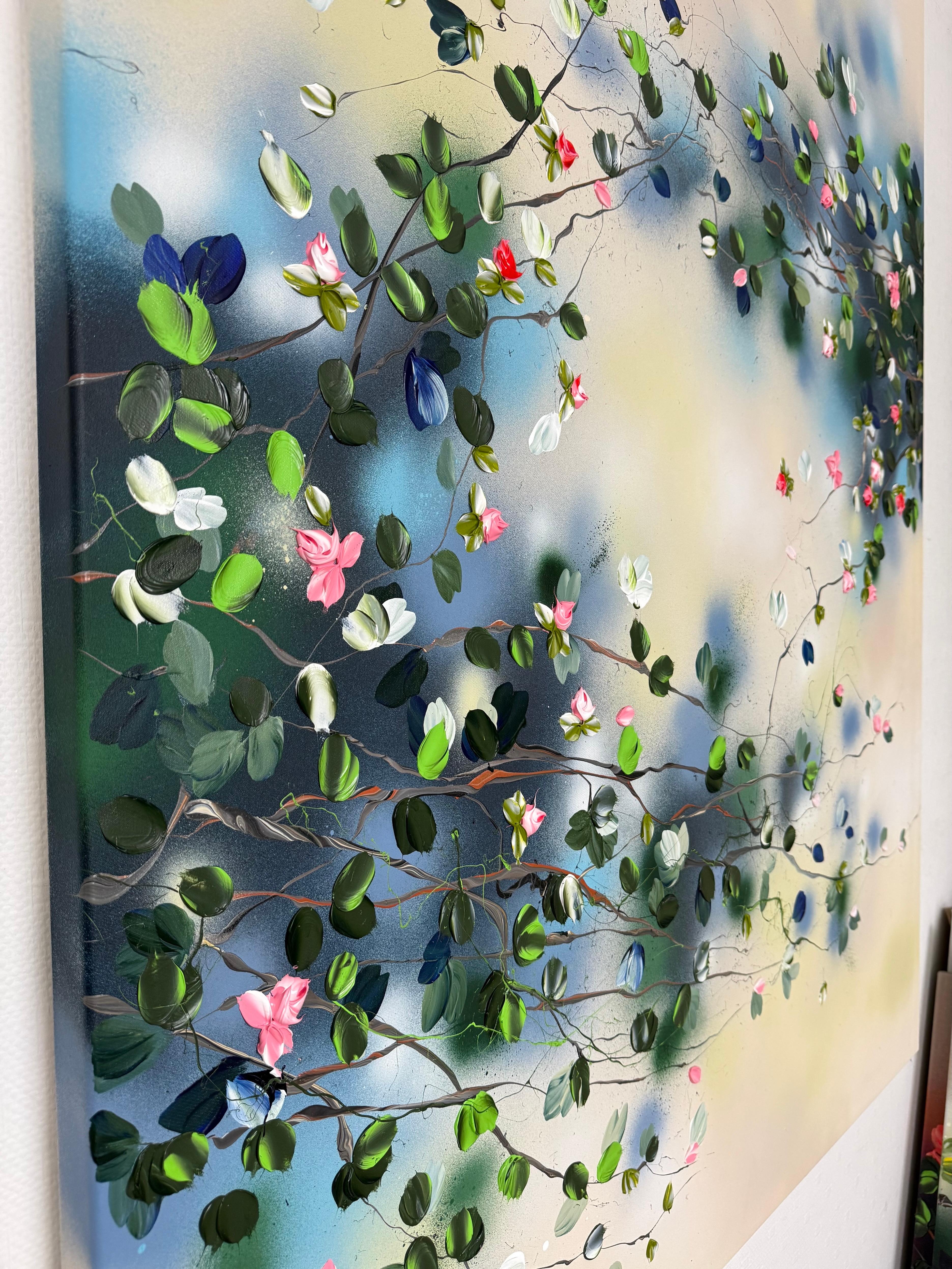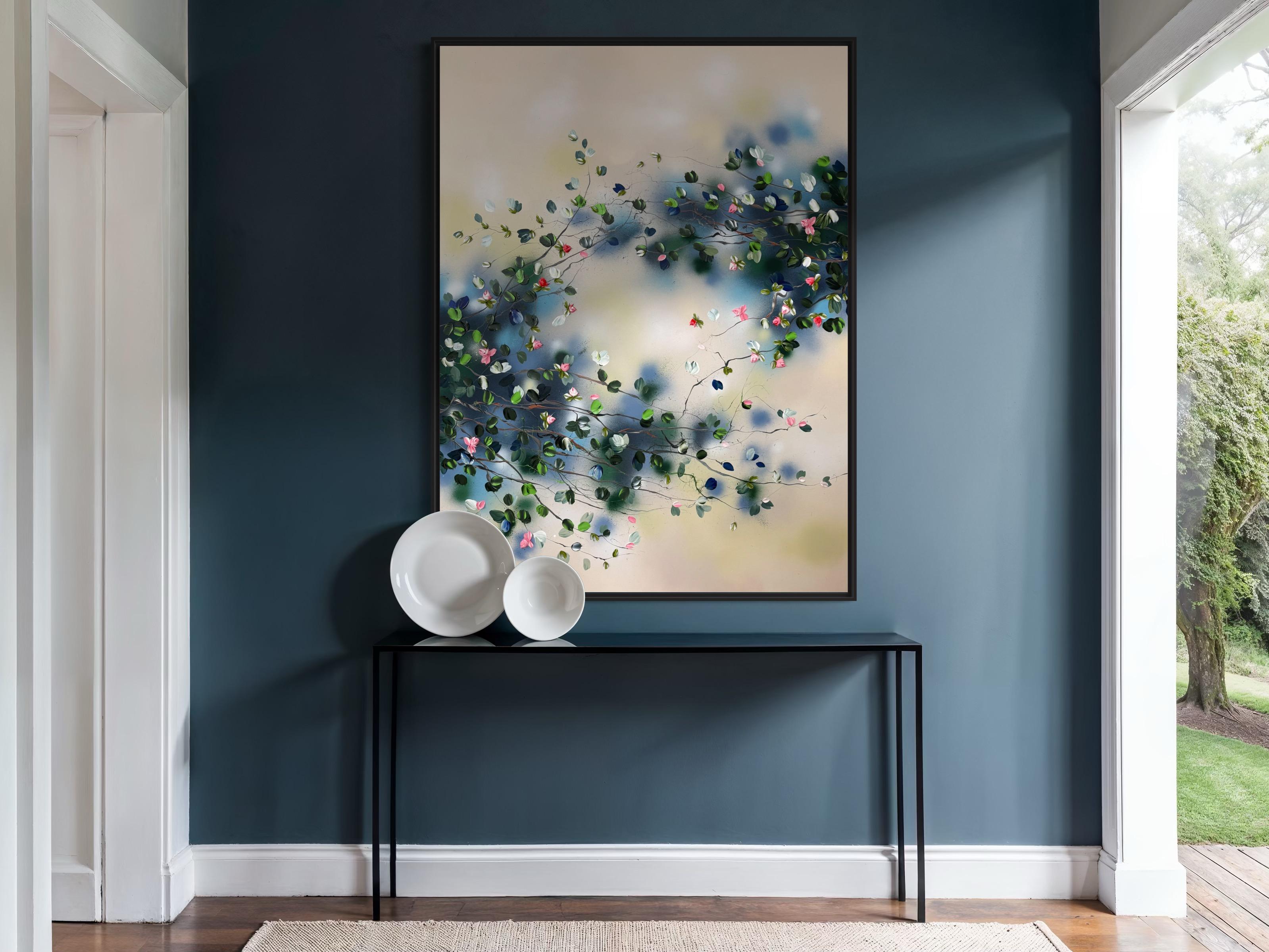 Calm Garden vermittelt Gelassenheit und Ausgeglichenheit durch ein Zusammenspiel aus sanften Tönen und strukturierten Blüten. Auf Leinwand gemalt (134 × 174 cm, auf Keilrahmen 120 × 160 cm), entfaltet sich die Komposition mit zarten Zweigen, die Blüten in Rosa-, Weiß-, Tiefblau- und frischen Grüntönen tragen.