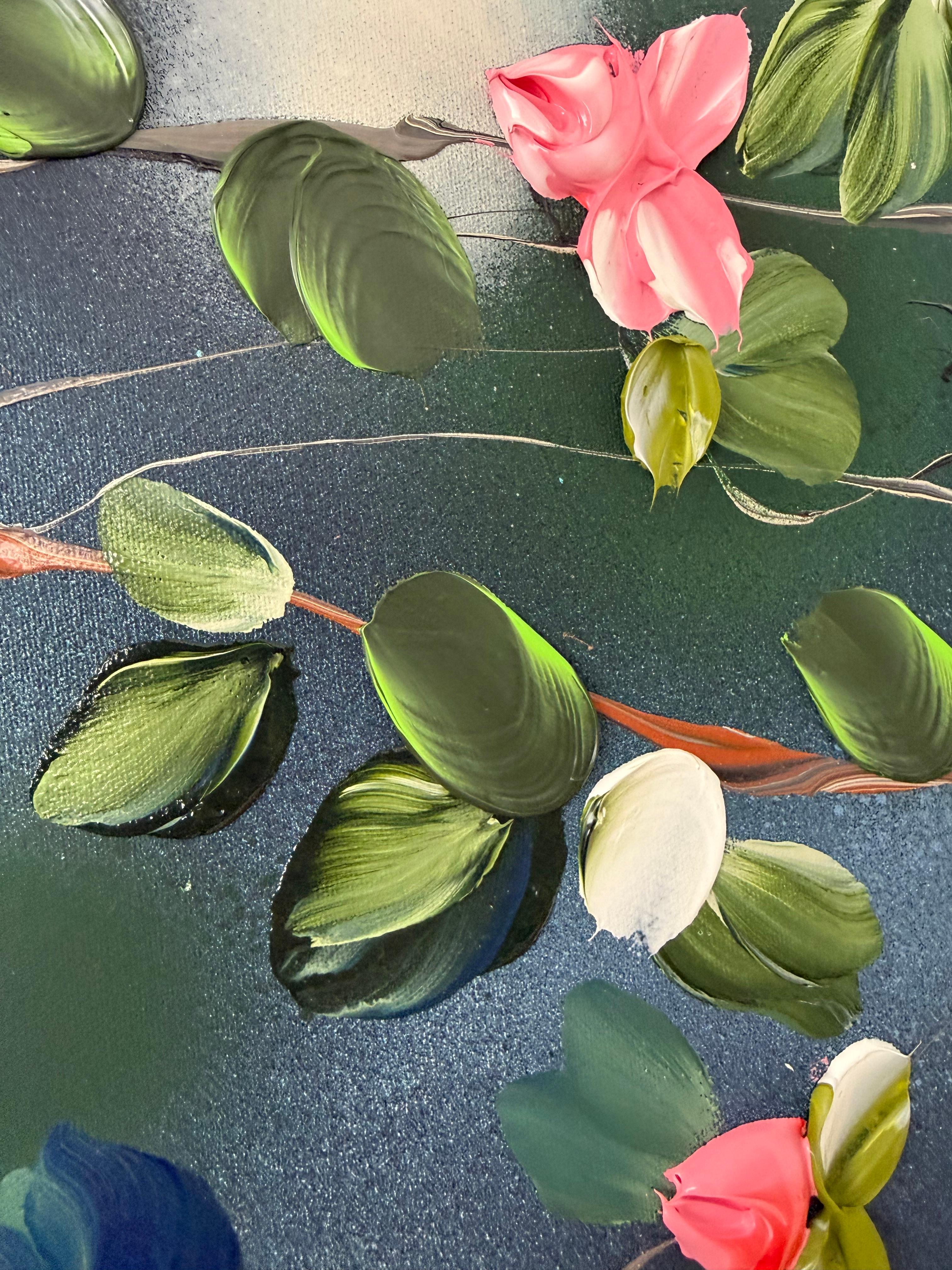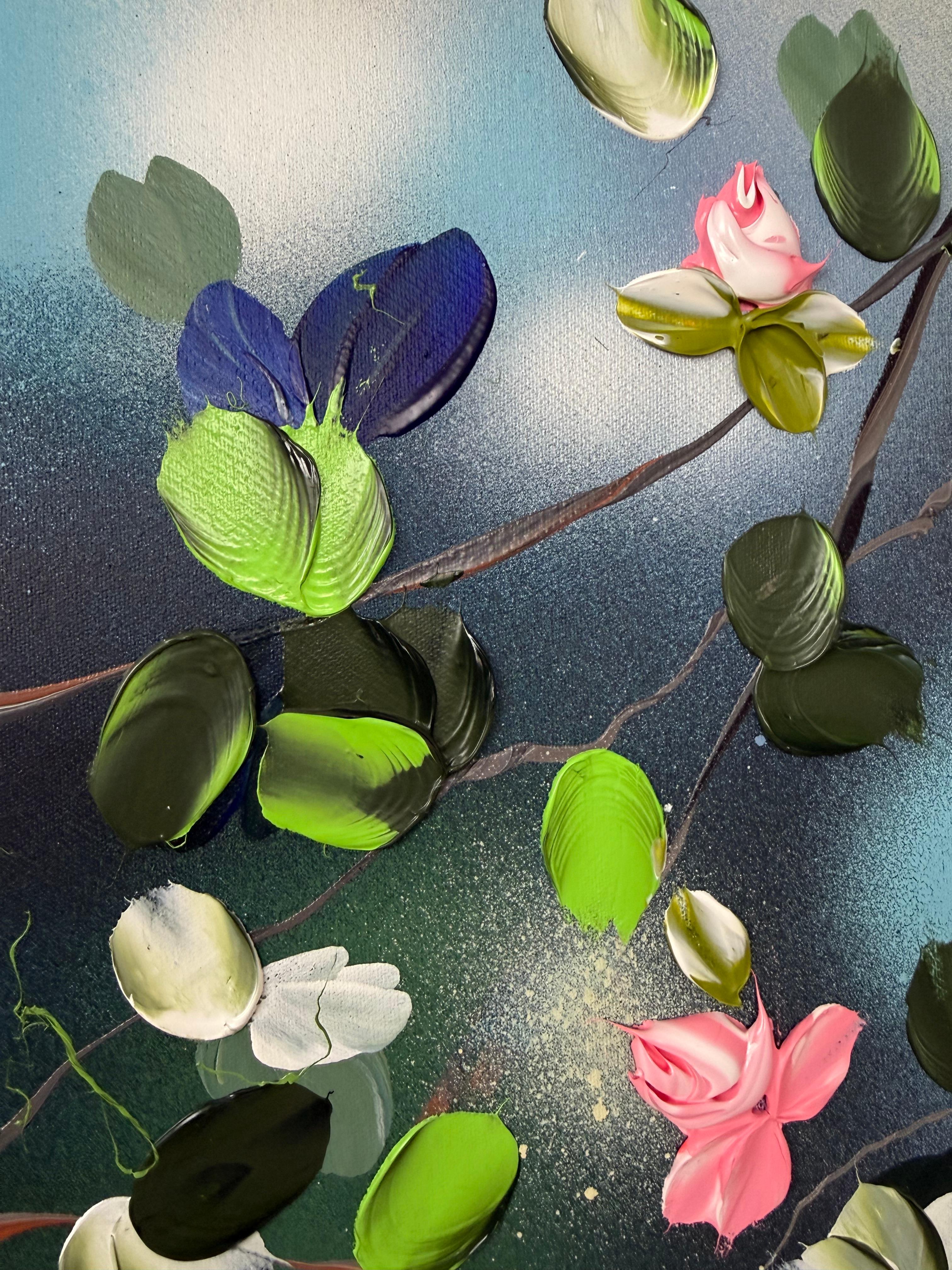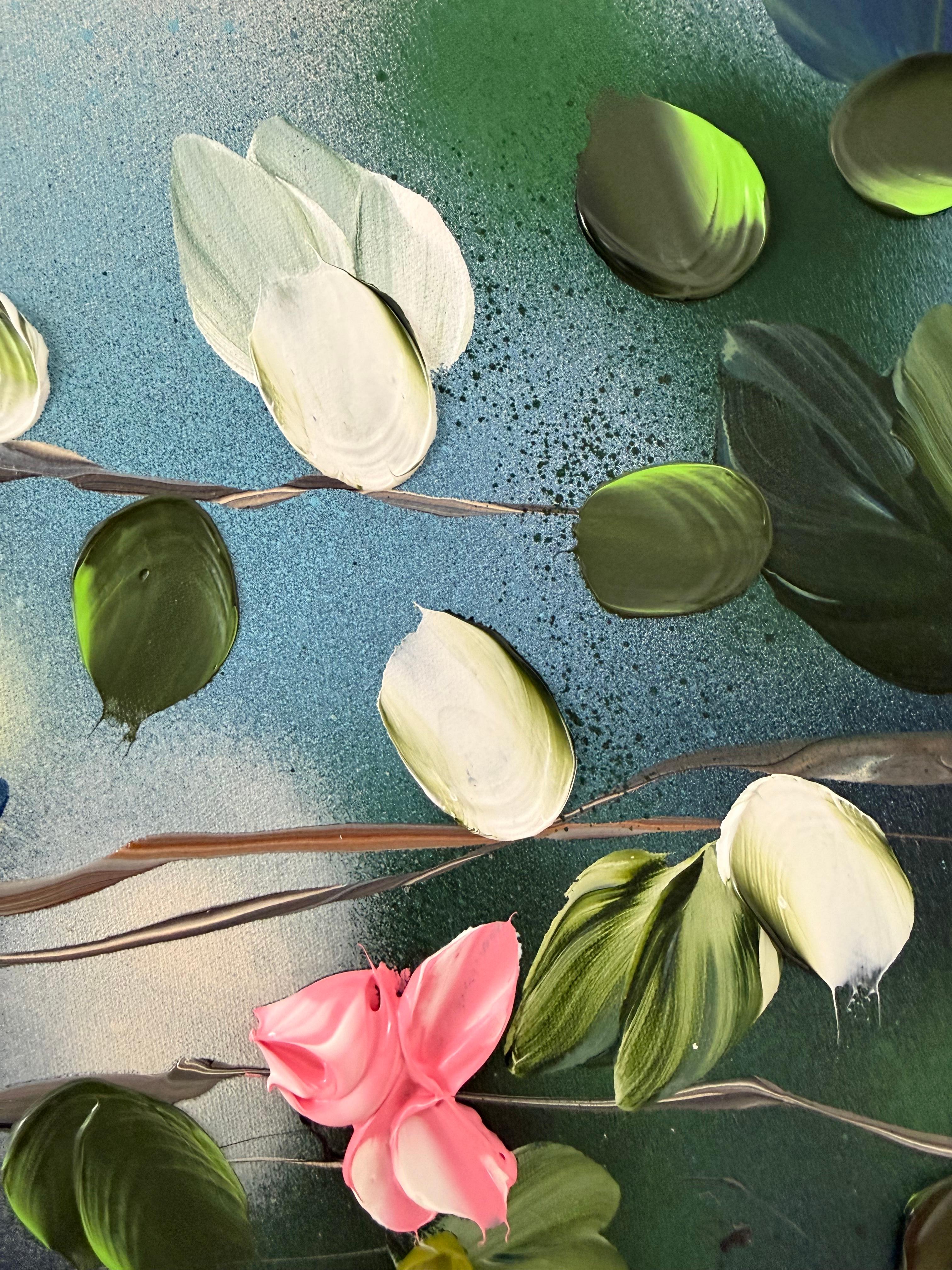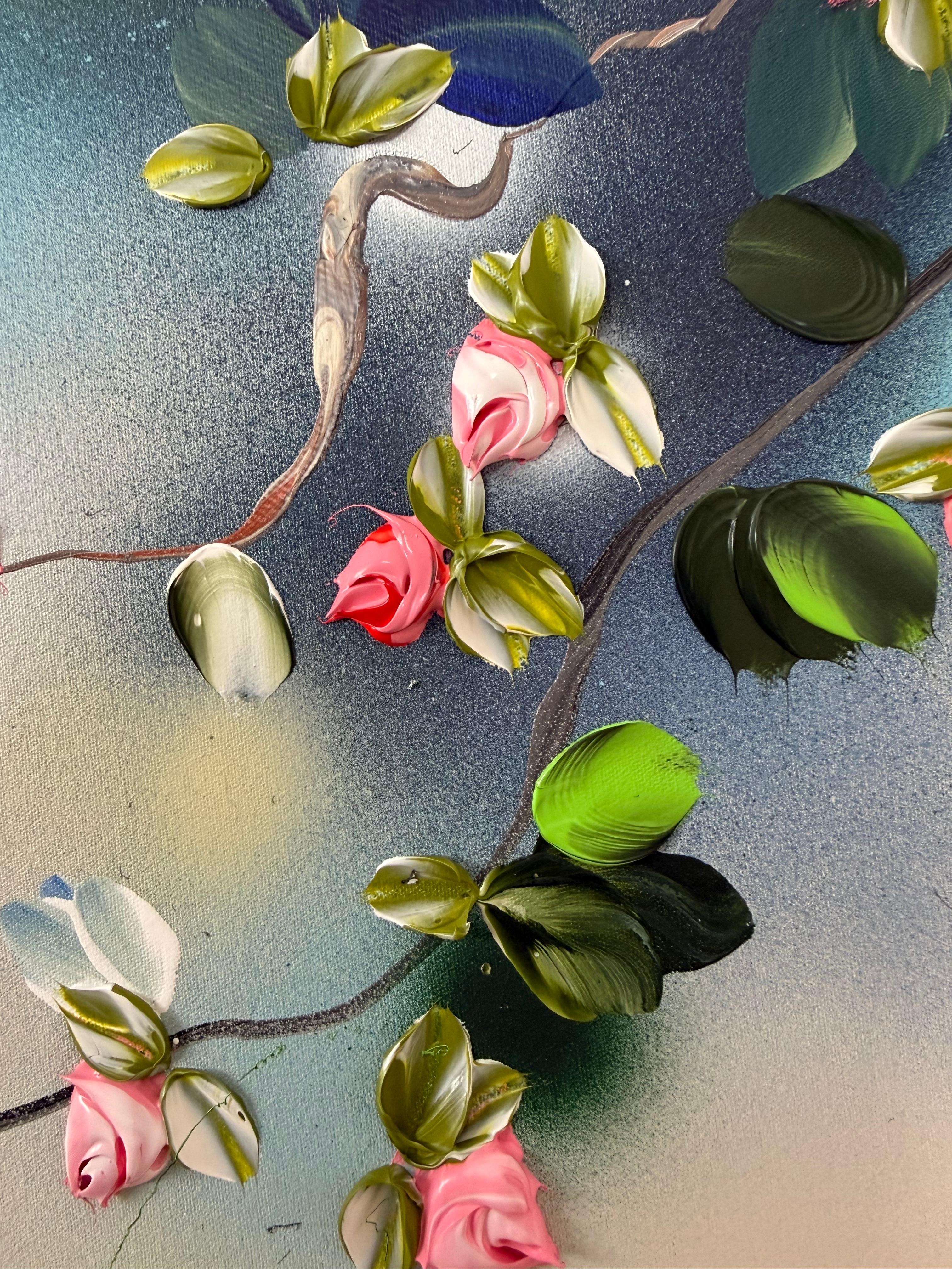 Calm Garden vermittelt Gelassenheit und Ausgeglichenheit durch ein Zusammenspiel aus sanften Tönen und strukturierten Blüten. Auf Leinwand gemalt (134 × 174 cm, auf Keilrahmen 120 × 160 cm), entfaltet sich die Komposition mit zarten Zweigen, die Blüten in Rosa-, Weiß-, Tiefblau- und frischen Grüntönen tragen.