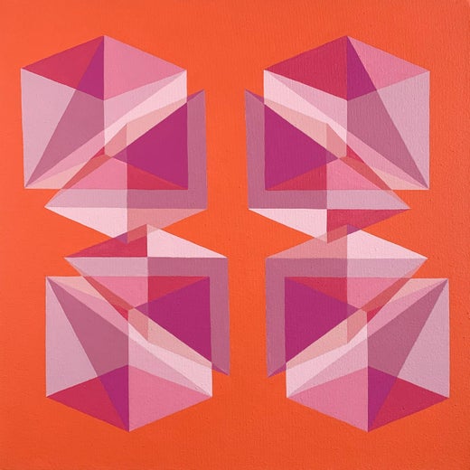 Benjamin WeaverInterlocking #4: geometrisch abstrakte Op Art Malerei; blaue Quadrate Würfel auf grau2022