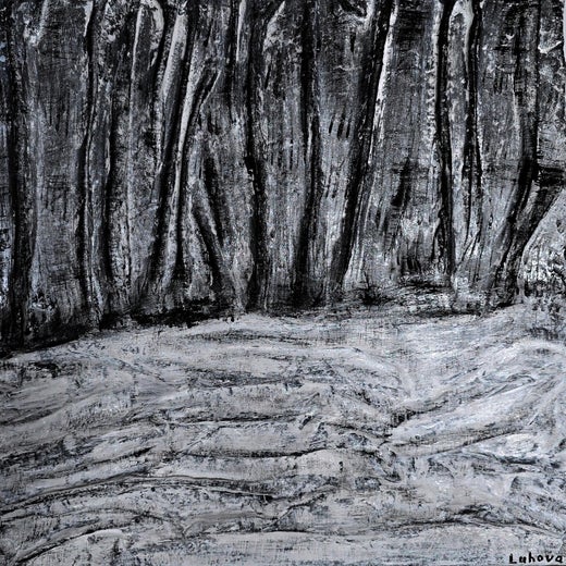 Dieses monochrome abstrakte Gemälde vermittelt die stille Einsamkeit einer Winterlandschaft durch kräftige Texturen und Kontraste. Die Komposition ist in zwei Abschnitte unterteilt: den oberen Teil, der durch vertikale, taktile Striche gekennzeichnet ist, die an Baumstämme erinnern, und den unteren Teil, in dem geschwungene weiße Texturen an eine schneebedeckte Weite erinnern.