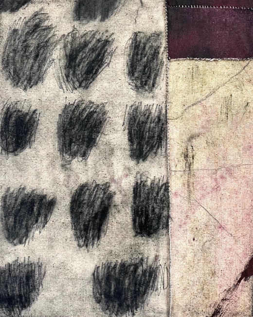 "Die Collage spielt in meiner Praxis eine zentrale Rolle - Leinwandfragmente, die übereinander geschichtet werden, zerrissene Ränder und sich überlagernde Texturen, die in jedem Werk ein Gefühl von Geschichte vermitteln. Diese Oberflächen entwickeln sich instinktiv und nehmen Unvollkommenheiten in Kauf, wenn Schichten aufgetragen, wieder abgekratzt und neu aufgebaut werden. Die Körperlichkeit dieses Prozesses spiegelt die Erinnerung selbst wider - manche Momente stehen kühn da, andere sind verschüttet, aber immer präsent.