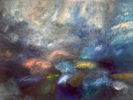 Dieses bezaubernde abstrakte Werk ist eine wolkige, gefühlsbetonte Komposition mit impressionistischem Pinselduktus. Karine Lahannier malt in einem meditativen Zustand und liefert ei...