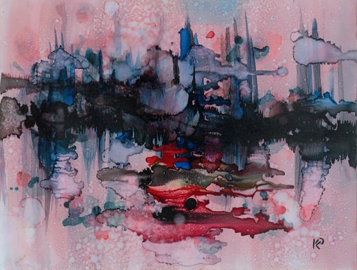 Teil 3 der "Genesis"-Serie von KC Pollak schließt mit einer weiteren einfachen Komposition ab, deren Form sich jedoch noch weiter entwickelt hat, indem sie sich ausbreitet und weiter zum Rand des Papiers hin fließt. Die Bewegung in diesem Werk erweckt fast den Eindruck, als würde die Tinte über die Komposition tanzen, und zwar im wahrsten Sinne des Wortes mit abstrahierten Beinen, die springen, und Armen, die sich nach oben strecken. Es gibt ein großartiges Nebeneinander von undurchsichtigem Rot und Violett neben der weicheren, transparenteren Tinte, die sie umgibt.
