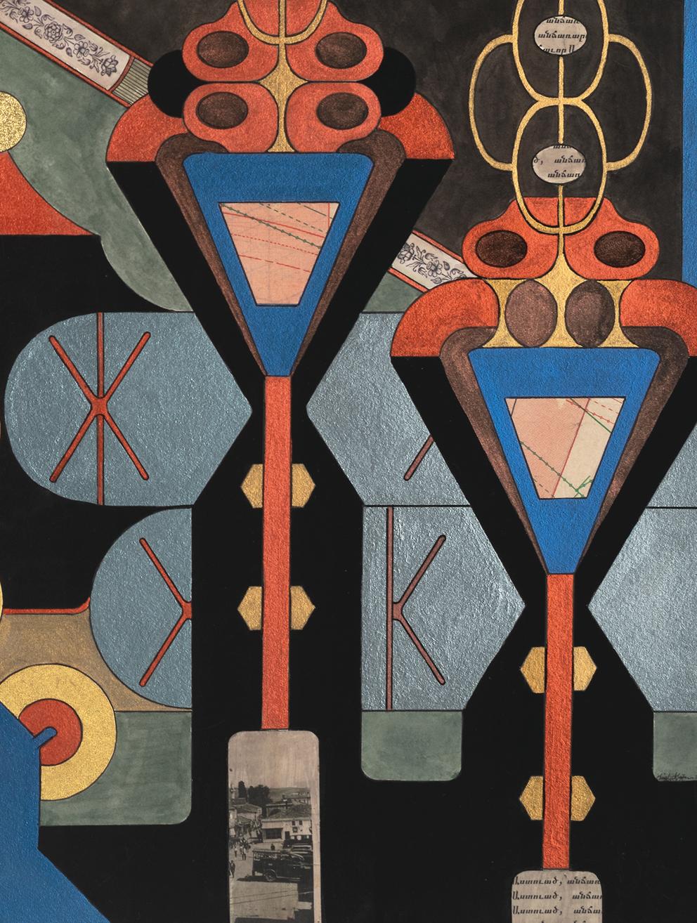 Linda Ganjian’s work, comprising collages, patterned landscapes, and wall-based reliefs, embodies a fusion of architectural and sculptural elements, deeply influenced by her Middle Eastern heritage. Her intricate miniature cities serve as symbolic representations of her personal and communal histories. These detailed works reflect the rich tradition of storytelling found in the ornamental designs of oriental rugs and the intricate architectural details of mosques and temples. Through their high level of ornamentation, Ganjian’s pieces convey complex narratives rooted in historical and communal experiences.