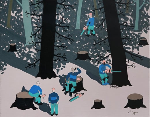 Die Quelle der Kunst des jungen Künstlers Michal Cygan liegt in der schlesischen Landschaft, sowohl in ihrer materiellen als auch in ihrer kulturellen Dimension. In Form eines dreidimensionalen Modells werden die Wahrzeichen der Region - Familienhäuser, ein Schachtturm, ein Druckturm und unterirdische Grubengänge - dargestellt. Sowohl auf dem Boden als auch darunter leben Menschen: Sie haben ihre Häuser an der Oberfläche, sie feiern hier, sie kämpfen und lieben hier. Sie gehen unter Tage zur Arbeit und erlernen den in Schlesien traditionellen Beruf des Bergmanns. Der Künstler ist fasziniert von der Form der Architektur und der spezifischen Infrastruktur, die die schlesische Industrielandschaft ausmachen, aber ebenso wichtig ist ihm der Reichtum der vielfältigen Beziehungen, die zwischen den Bewohnern bestehen. Michal Cygan ist selbst nicht aus Schlesien, was es ihm ermöglicht, sich seinem Thema ohne Pomp zu nähern, und zwar auf eine originelle Art und Weise, die von einer Faszination zeugt, die nur schwer zu erreichen ist, wenn es um unsere alltägliche Realität geht. Schlesien wird in seiner Perspektive zu einem märchenhaften Ort, wenn auch zu einem Märchen für Erwachsene. Einzelne bunte Bäume werden zum Archetyp des Apfelbaums im Garten Eden, und die Liebenden unter ihm verwandeln sich in Adam und Eva. Einzelne Ereignisse erhalten eine zeitlose Dimension. Die Oberflächen von Häusern, Bäumen und menschlichen Figuren sind mit farbenfrohen Mustern bedeckt, die gleichermaßen die Energie und das Potenzial der Region wie auch die Emotionen des Künstlers selbst zum Ausdruck bringen. Rosa und grüne Flecken verlaufen wie Fäden, die die Beobachtungen des Betrachters und die Vision des Künstlers miteinander verbinden und eine geschaffene Welt bilden, die dennoch in unserer Wahrnehmung verwurzelt ist.